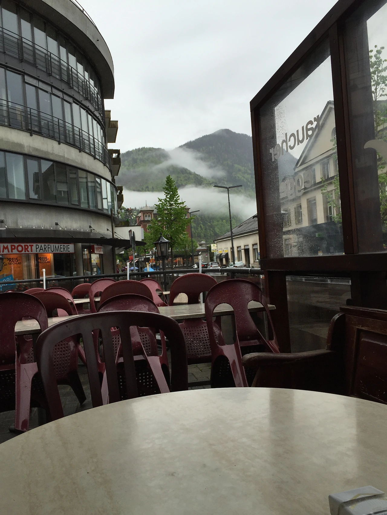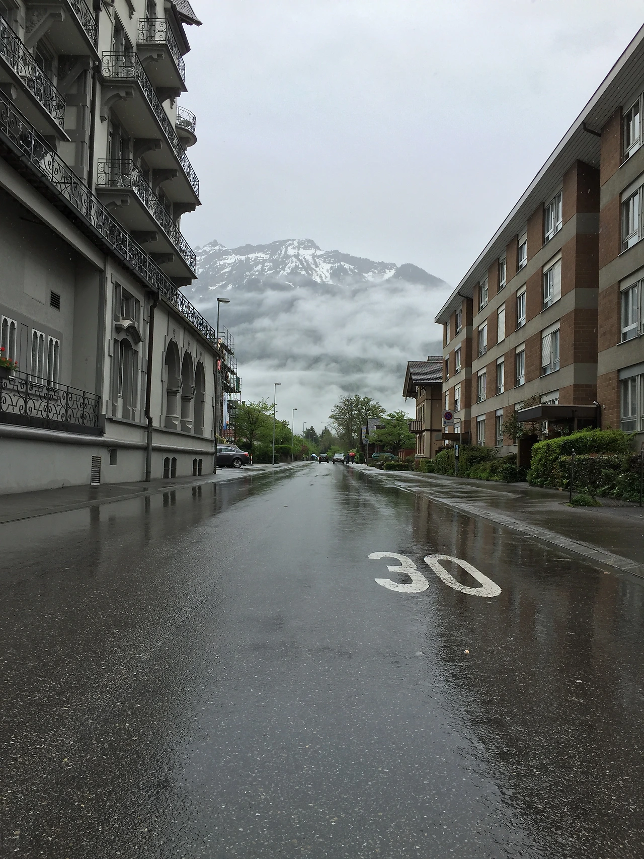 하지만 지금 담배를 피우며 비 내리는 인터라켄을 보고 있다.