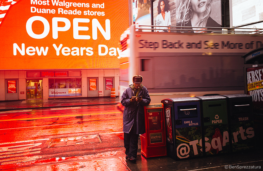 그리고 채도가 낮은 빨간색의 향연이 시작되었다. 좀 더 정확히 말하면 비 오는 타임스퀘어 광장을 말한다. 수많은 전광판에 비친 모든 빛들이 고스란히 바닥으로 떨어져 색의 축제가 시작된다. 나는 아직도 이 사진을 찍던 순간의 짜릿한 강렬함을 잊을 수가 없다. 그저 멍하니 그것을 바라만 보다가, 느릿느릿한 걸음으로 들어오는 한 남성을 보게 되었다. 우산도 쓰지 않은 채 홈리스인지, 투어리스트인지, 혹은 네이티브인지 알 수 없는 중년의 남성을 말이다.