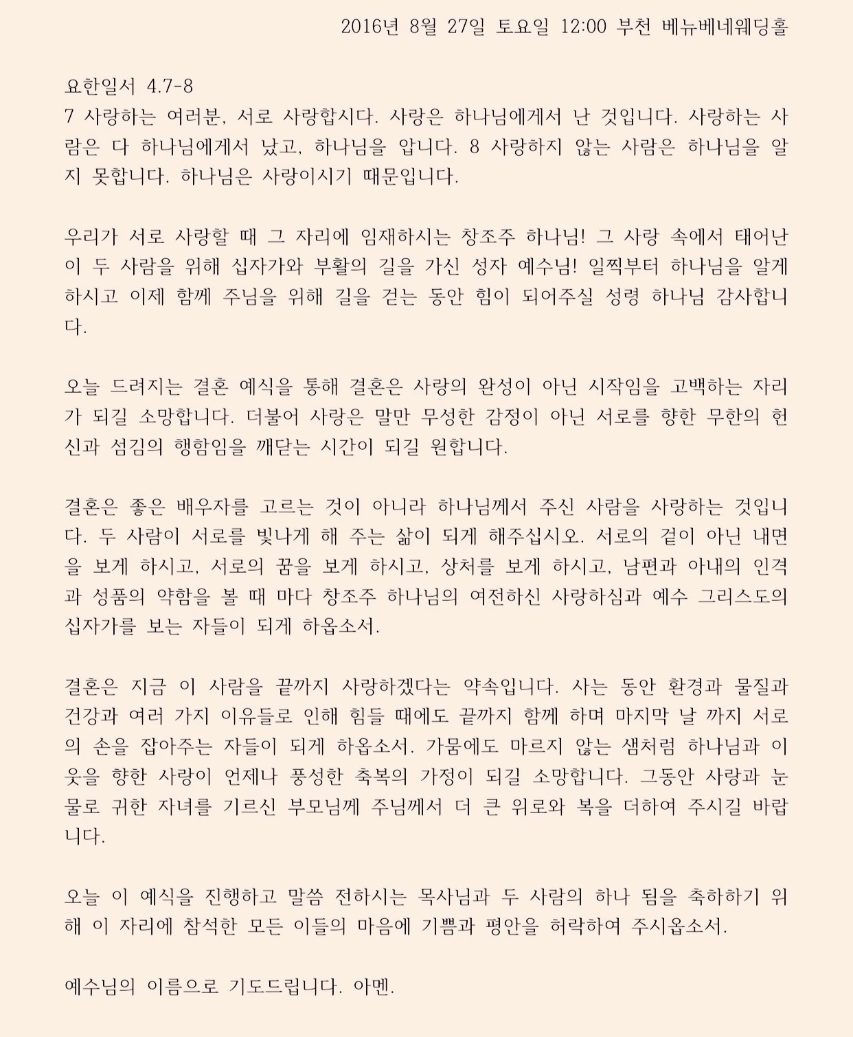 우리 두 사람의 결혼예식을 위해 군종병 시절 인연을 맺기 시작한, 그리고 결혼에 이르기까지 많은 도움을 주셨던 박희찬 목사님의 축복의 기도문.