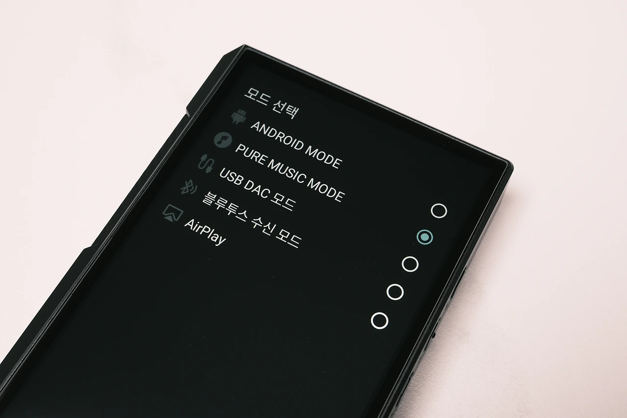 원활한 스트리밍 서비스를 활용하거나, 스마트폰의 사용에 익숙하신 분들은 안드로이드 운영체제를 사용하면 됩니다. 하지만 어떤 고음질 스트리밍 서비스도 음원을 저장해서 직접 재생하는 방식을 이길 수 없고, 안드로이드 운영체제가 음원을 재생할 때에 이런저런 제약을 걸거나 간섭을 하기 때문에 M11S로 들을 수 있는 가장 고음질의 재생 방법은 PURE MUSIC MODE 선택입니다.