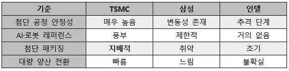 다만, 양산 안정성과 첨단 패키징 역량 측면에서는