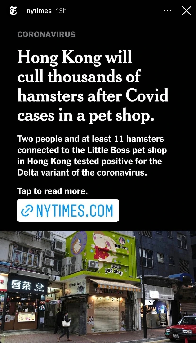 이틀 전 내가 사는 홍콩에서 추적할 수 없는 델타 변이 코비드 바이러스 감염 사례가 나왔다. 새로 발견된 코비드 양성 확진자는 우리나라의 명동이라 볼 수 있는 코즈웨베이라는 지역의 애완동물 샵에서 일하는 직원이었고, 전수 검사 결과 애완동물 샵의 햄스터 몇 마리에서 같은 델타 변이 바이러스가 발견이 되었다고 한다. 아직까지 동물 - 사람 간의 감염이 정확히 증명된 것이 아니지만 홍콩 정부는 '방어적인 조치' 차원에서 홍콩에 현재 들어와 있는 햄스터 2,000여 마리를 모두 폐사시키기로 결정했다.
