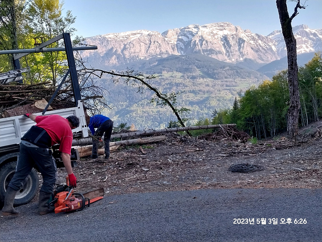 판자 등 목재가 필요하면 산에서 직접 베어온 나무로 판자를 켜고, 목재를 다듬어 온 집을 다 수리한다. 알프스 고산지대에는 싸뺑(Sapin, 전나무)이 많이 자라고 있는데 근래에 들어서면서는 지구온난화로 인해 벌겋게 죽어가는 나무들이 많다. 죽은 나무들은 주민들이 베어내도 된다고 한다. 마르틴느네 집 바로 앞에는 쟝의 친형 죠르쥬 내외가 살고 있는데 그 집도 형제가 직접 지었다. 건축 자재를 사다가 지은 것이 아니라, 산에서 나무를 베어다가 지었다. 10년이 걸렸다고 한다.