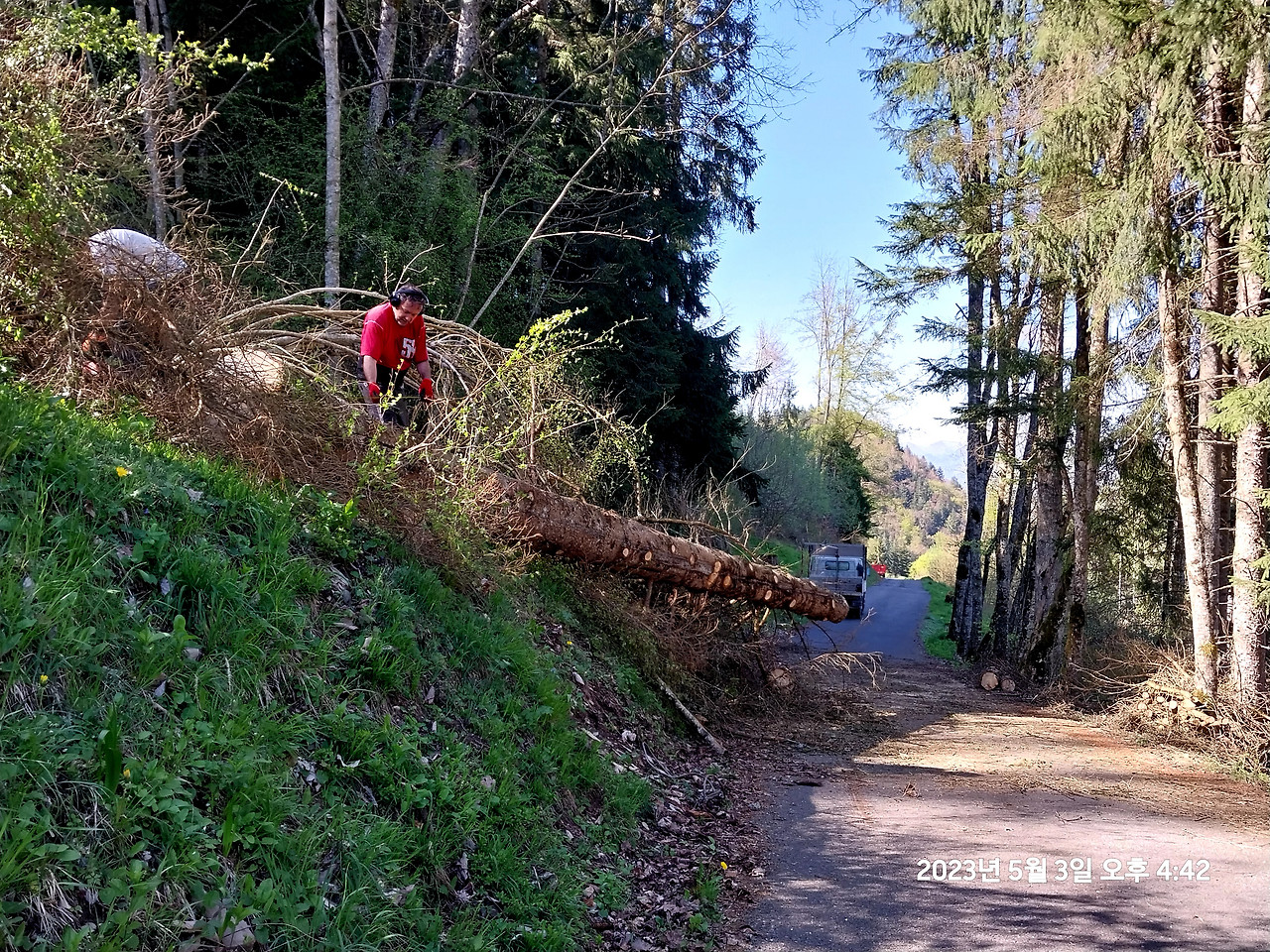 산을 내려오는 길에 난방용 땔나무도 가득 실었다.