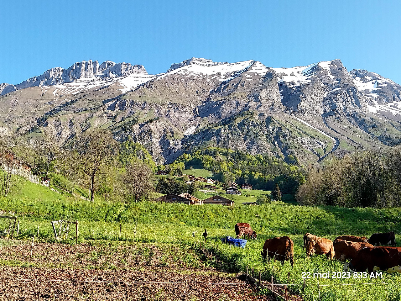 나는 오전 8시부터 12시까지 까트린느가 지시하는 채소밭 가꾸는 일에 전념했다. 200여 평 되어보이는 까뜨린느네 채소밭은 그림 같은 아라비산을 배경으로 집 위쪽으로 펼쳐진 비탈진 목초지 옆에 있었다. 감자, 양파, 딸기, 호박, 민트, 양상추 등을 심어 놓았다. 나는 하루가 다르게 자라 올라오는 잡초를 뽑아내고 서너 평의 목초지를 개간하여 민트를 비롯한 몇 가지 허브를 심었다. 처음에는 농기구를 들고 비탈진 목초지를 걸어 올라가 밭에까지 가는 것만 해도 숨이 찼다. 하지만 이 그림 같은 알프스 산중에서 맑은 공기를 마시며 육체노동을 할 수 있다는 것은 더없이 행복한 일이었다. 혼자서 밭을 일구고 있으면 어느샌가 소떼들이 몰려와 낭랑한 워낭소리로 황홀한 합주를 들려주었고, 동네의 할아버지인 니꼴은 매일같이 찾아와서 말동무를 해주었다. 나는 그가 마치 옛날 내 고향 시골 동네사람처럼 느껴졌다.