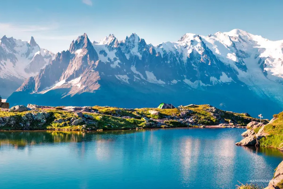 맑은 날의 Lac Blanc. 건너다 보이는 산의 오른쪽 끝 완만한 봉우리가 바로 알프스 최고봉 몽블랑(4880m)이다. https://mapetiterando.fr/