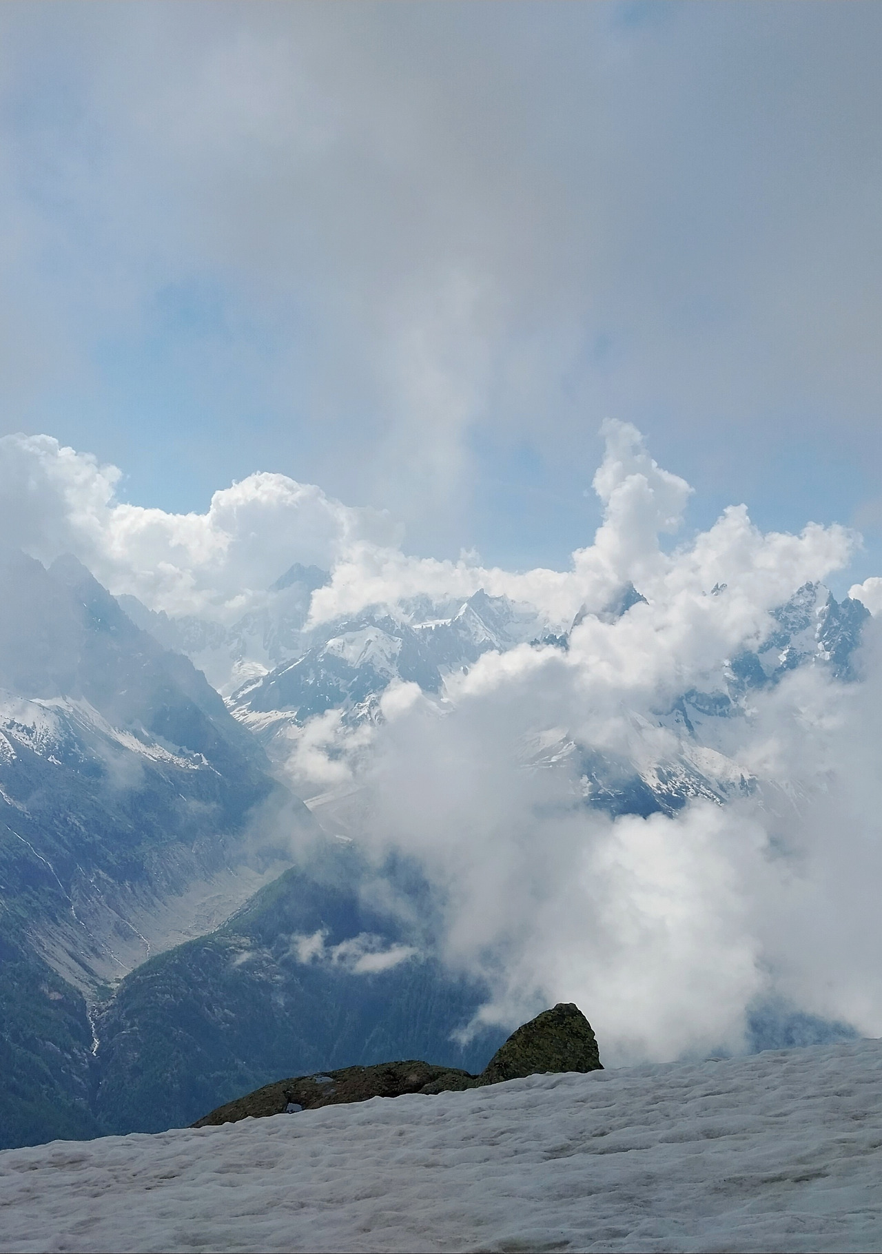 건너편 빙하계곡 La Mer de Glace 가 온난화로 인해 바닥을 드러내고 있다. 산들이 높아 구름을 허리에 두르고 산다.