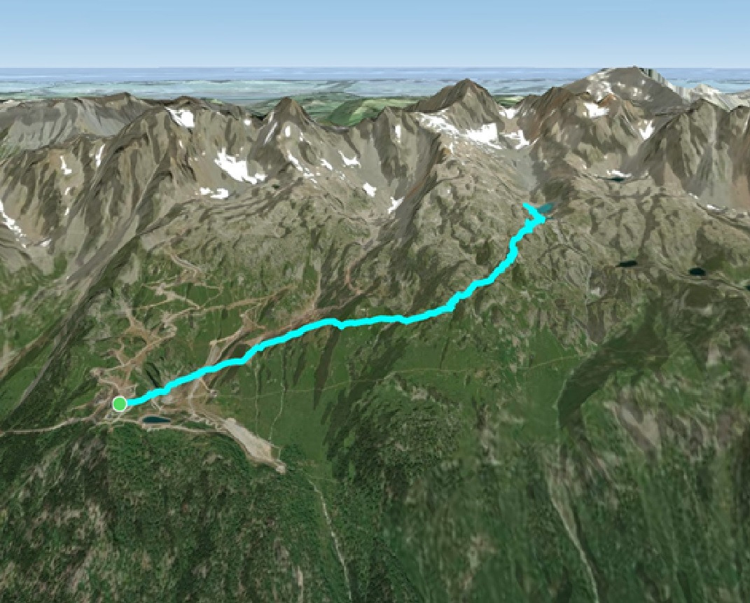 플레제르(녹색 지점)부터 걷기 시작하면 등산로가 비교적 완만하며 잘 정비되어 있다. 플레제르까지 케이블카로 올라간다. 위 그림에 표시된 등산로의 표고차는 580m, 왕복 8km