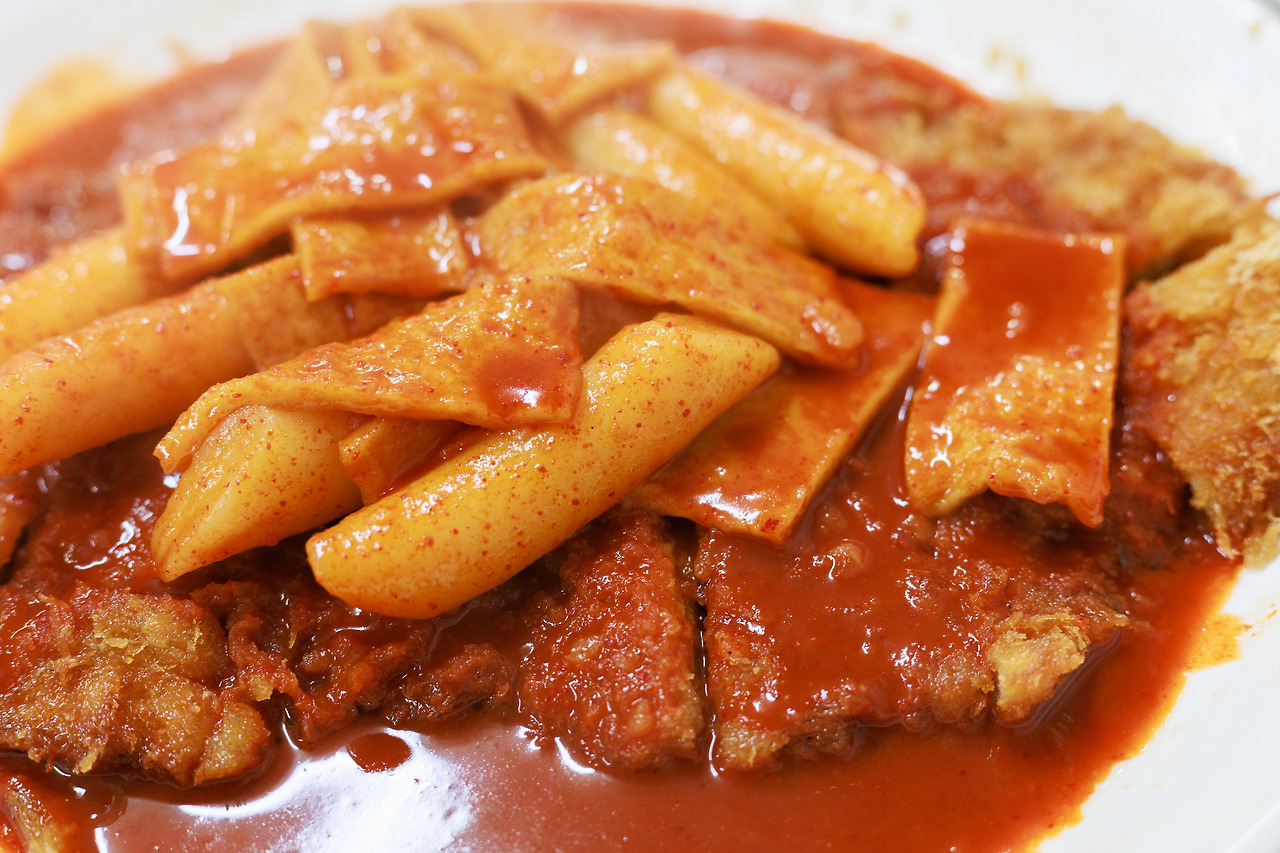 떡볶이를 튀김과 같이 먹으면 맛있다는 데 이의를 제기할 사람은 없을 겁니다. 돈가스 토핑을 파는 떡볶이 집도 있고요. 하지만 이곳에선 떡볶이가 돈가스의 토핑이라는 점을 분명히 합니다. 소스는 우스타 소스에서 떡볶이 소스로 한참 가다가 만 어느 지점에 있더군요. 매콤했습니다. 떡은 물론 돈가스에도 잘 어울렸습니다. 회사 근처 비어할레에서 점심마다 파는 ‘매운 돈가스’와 비슷한 느낌도 났습니다. 양도 8천 원이라는 가격이 서운하지 않을 만큼 많았습니다. 일반적인 왕 돈가스 크기에 떡볶이 반인 분을 더 올렸으니(거기에 공기밥도 나옵니다) 요즘 다이어트를 고민하고 있는 사람에게는 치명적일 수밖에 없었지만 말이죠.