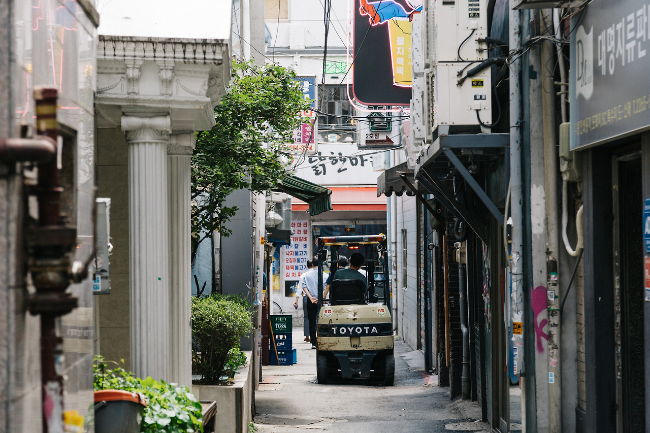 명확한 구역이 나눠져 있는 건 아니지만, 걸으면 분위기가 바뀌니까 다음 구역으로 넘어왔구나 알 수 있습니다. 타일, 페인트, 조명, 포장용기처럼 허름한 상가를 반짝반짝 빛내는 색색의 물건들이 구경할 맛을 나게 합니다. 아, 골목골목 인쇄기와 금형기를 배경으로 사람들이 몰려드는 카페와 식당 발견하는 재미도 있습니다. 유행 따라 ‘을리단길’ 같은 별명 대신 ‘힙지로’라는 독자적인 형식의 이름을 취했으니 이곳의 개성이 얼마나 남다른지 짐작할 만합니다. 하긴 모든 ‘O리단길’들처럼 이곳은 1~2km 남짓한 거리에 온갖 요식업소가 다 구겨져 들어간 장소가 아닙니다. 대체로 2~30년은 무색할 만큼 오래 자리를 지킨 소규모 사업체가 중심이지요. 젊은이들이 셀카를 찍어 올리는 힙한 장소들이 점점이 포진해 있다고 해서 지게차, 핸드 카트, 오토바이와 삼발이가 좁은 골목을 누비는 속도는 줄어들지 않습니다. 누군가 시간을 소비할 때, 누군가는 돈을 벌고 있습니다. 그 무심함과 집중력이 이곳을 ‘힙’하게 만드니, ‘힙지로’라는 유행어도 꽤 적절한 별명이라고 인정할 수밖에 없네요.