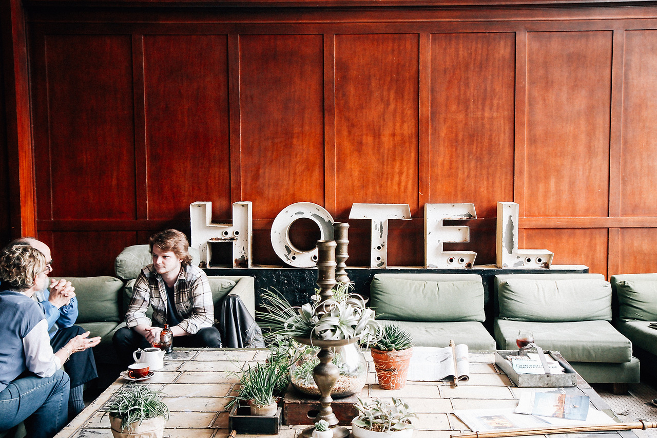 일단 자리를 잡자 마음이 편해졌다. 초콜릿 같은 나무 벽, 공장 외벽에 붙어 있었을 법한 철재 알파벳(H.O.T.E.L), 물 빠진 청록색 소파와 버려진 걸 주워온 듯한 화분까지. 누군가 아무 생각 없이 놓아둔 것들이 우연히 조화調和를 이루고 손때를 타며 맵시를 갖춘 것만 같은데, 그렇다고 믿자니 그건 그것대로 말이 되지 않는 조화造化였다.