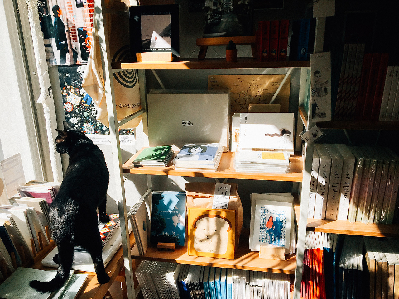 박성민 씨는 사무실에서 만들고 있는 여행 잡지에 기고해 주신 덕에 알게 되었다. 내가 원고 요청을 하지는 않았지만, 그의 글을 여러 번 읽고 (마음대로) 교정하는 과정에서 오래전에 잠깐 인사라도 나눈 사이 같은 친근함을 느꼈다. 문을 열자마자 기회를 노리던 고양이가 바깥으로 튀어나왔다. 덕분에 멋진 인사말 대신 "쟤 저렇게 나갔다가 다시 돌아오나요?"라는 어줍은 말이 튀어나오고 말았다. 방금 고양이 실종 사건의 빌미를 제공했을지 모른다는 죄인의 심정이 담겨 있었다. 돌아다닐 때마다 공간이 지워진다고 착각할 만큼 새까만 고양이는 이십여 분 후에 책방으로 돌아왔고, 우리가 서점을 나올 때 두 번째 산책을 나섰다. 그것이 그 아이의 일이었다. 책 위에 웅크리는 것도 포함해서.