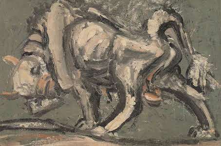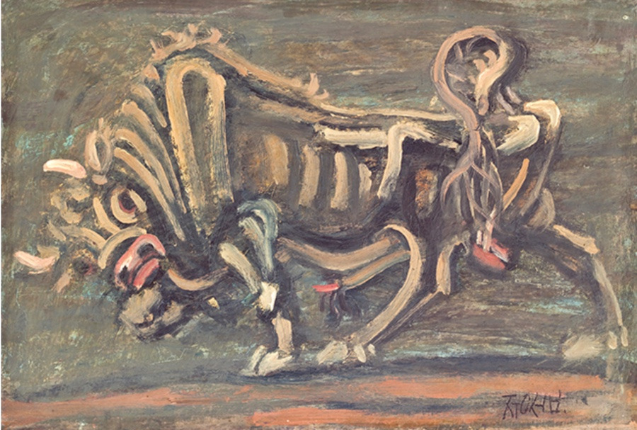 그림 속 흰 소가 변화하는 것이 보이시나요? 1952년의 흰 소는 당장이라도 그림 밖으로 뛰쳐나올 것 같습니다. 눈빛이 부리부리하고, 그 기세가 등등해 보이는데요. 1956년의 흰 소는 형체가 뭉그러져 있고 눈빛도 흐리멍덩하죠. 이전 그림에서 느껴졌던 그 기세는 온대 간데없습니다.