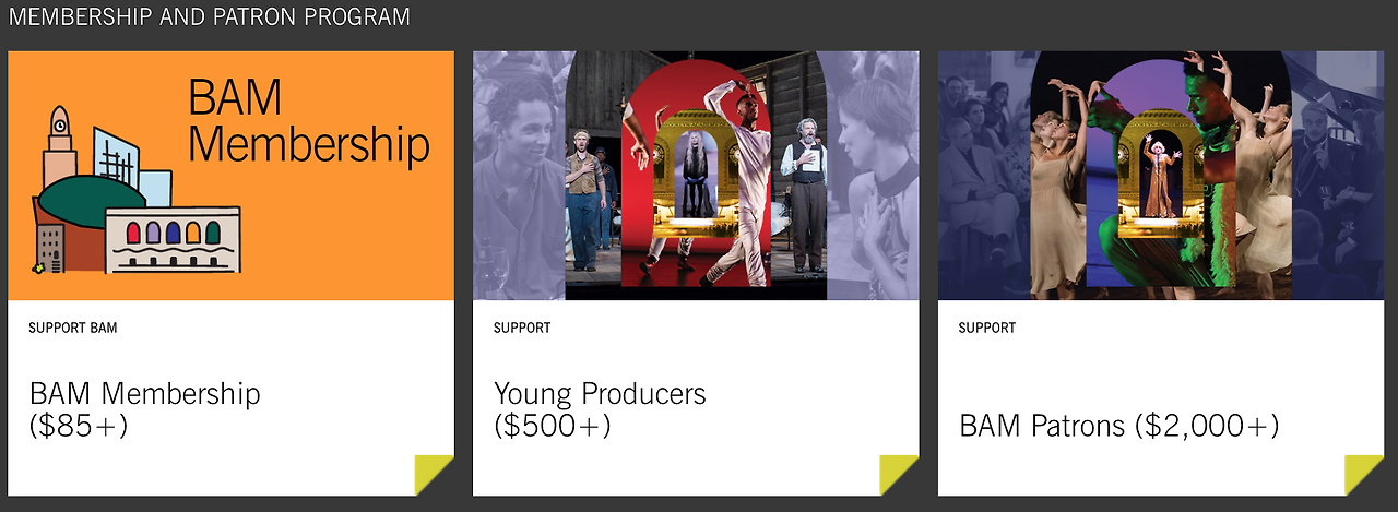 BAM은 비영리 극장임에도 불구하고 우수한 재정자립도를 갖추고 있다. 대부분의 예산은 기업이나 일반 관객들로부터 받는 기부금이나 멤버십 제도를 활용한 후원금으로 운영되고, 추가적으로는 공연 수익이나 예술 작품을 경매로 판매한 수익을 이용한다. BAM의 후원금 제도는 상당히 인상적인데, 적게는 85불부터 150불, 300불, 500불, 1000불까지 나누어 멤버십 제도를 운영한다. 500불부터는 Young Producer라는 명칭을, 2000불 이상은 BAM Patron이라는 명칭을 붙여 놓았는데, 물론 금액별로 받을 수 있는 혜택 또한 다르다. 후원금은 BAM의 운영에서 아주 큰 부분을 차지하기 때문에 후원자들을 위해 마련한 프로그램이 매우 다채로운 것도 BAM의 특징이라 할 수 있겠다. 리허설을 관람할 수 있거나 아티스트들과의 대화, 공연 시작 전 식음료 제공, 후원자들끼리 커뮤니티를 형성할 수 있는 네트워킹 행사, 영화 상영 등을 다채롭게 운영하고 있다. 추가적으로 최근 Harvey theatre는 대규모 리노베이션을 감행했는데, 5천 달러 이상 기부한 기부자들에게는 극장의 역사가 담겨있는 벽돌에 이름을 새겨주고, 1만 달러를 기부한 사람들에게는 좌석에 이름을 새겨준다. 기부자들에게 역사적인 순간의 일부가 될 수 있는 기회를 제공하며 동시에 재정을 마련하고 있는 것이다.