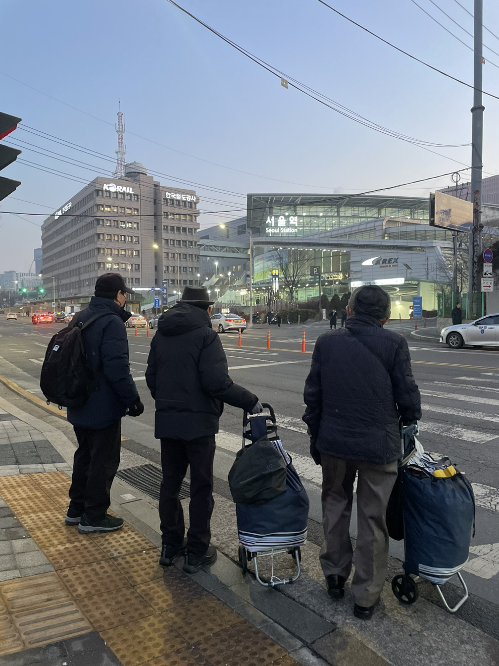 7시가 조금 넘은 시간, 지하철을 타러 서울역으로 향하던 어느 날 이상하게 문득 묘한 기시감이 느껴졌다. 옆을 바라보니 할아버지들이 있었다. 모두들 바퀴가 달린 시장가방을 끌고 계셨다. 처음엔 그저 지하철을 타러 가는 할아버지라고 생각했는데, 문득 이상함을 인지하고 살펴보니 모두 같은 가방을 끌고 계셨다. 가방들은 한결같이 꾸역꾸역 집어넣은 짐들로 금방이라도 터질 것 같았다. 바퀴 달린 가방을 안 끌고 나온 할아버지 또한 동일하게 터질 듯한 백팩을 메고 계셨다. 할아버지들끼리는 서로 아는 사이 같았다. 횡단보도 앞에서 파란 불을 기다리는 동안 할아버지들이 차례로 도착하는 대로 서로 눈인사를 하는 등 아는 체를 했기 때문. 그렇다고 친한 사이들은 아닌 것 같았다. 아는 체는 늘 짧게 끝났고 대화도 거의 없었다.