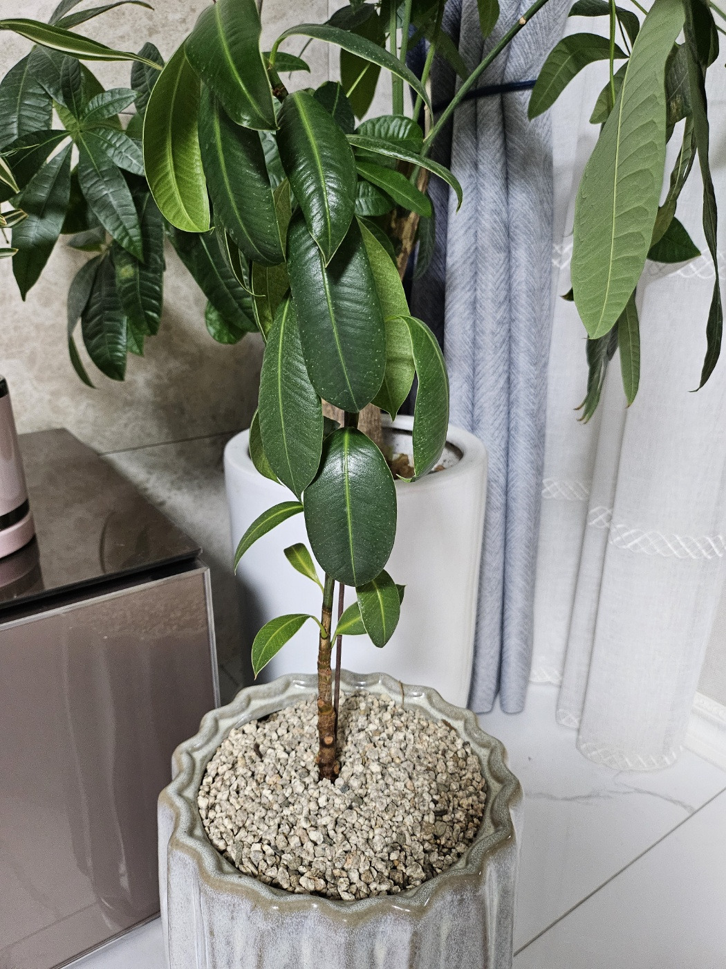 그리고 고무나무는 녹보수의 집으로 이사를 했다. 고개를 숙이고 있는 걸 본 사장님이 물을 더 많이 주라고 한다. 작은집에 뿌리를 내리고 버텨준 고무나무가 고맙다.