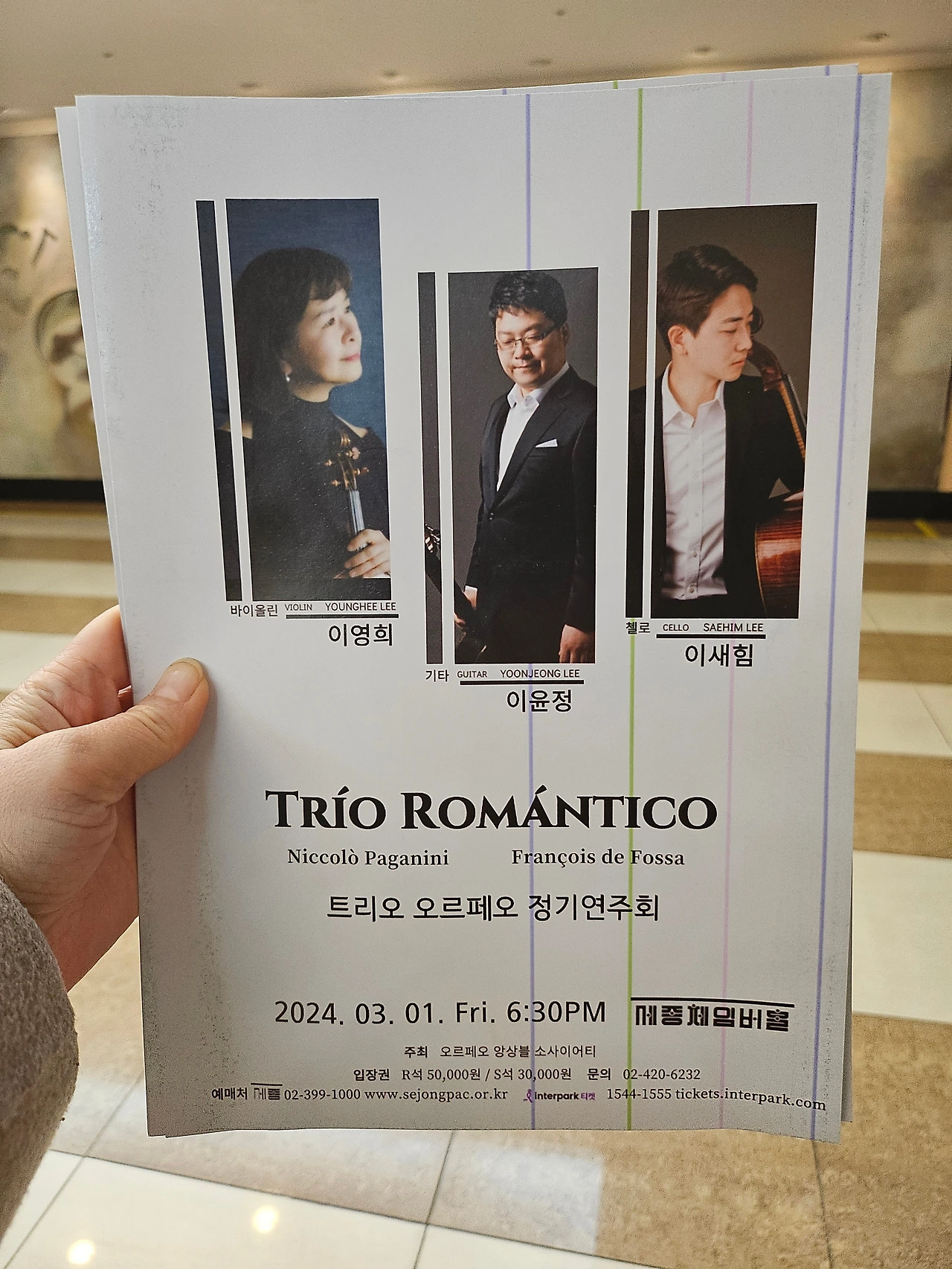 올해 생일을 앞두고, 지인의 클래식 기타, 바이올린, 첼로 삼중주 연주회에 초대받았다. 음악회 주제도 낭만주의 3인조이다. 기타 연주자가 낭만은 여유라고 말한다. 삶에 소풍 온 것처럼, 관조하는 태도를 갖는 것도 좋다고 이야기한다.