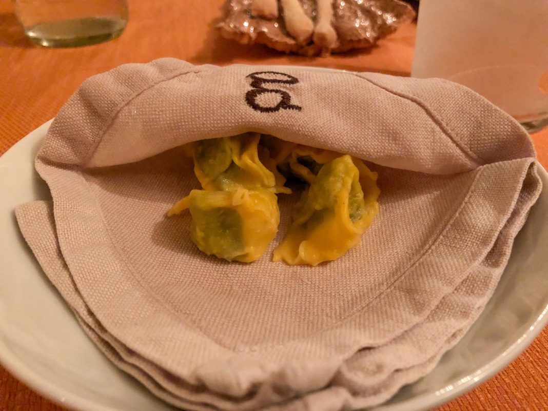 나는 리스토란테 귀도에서 아뇰로띠를 먹어봤다. 아뇰로띠는 이탈리아식 만두요리인 라비올리 중에서도 매우 특이한 요리다. 우선 전통방식에 의할 때 소고기, 돼지고기, 토끼고기라는 세 가지 육류가 들어간다. 야채는 시금치 정도만 살짝 섞는다. 사실상 필링은 고기가 전부다. 그걸 얇게 저민 생면 반죽피에 싸고 아주 작은 모양으로 굴려낸다. 이때 손톱으로 꼬집듯이 작게 떼어낸다고 해서 '플린'(plin)이라는 별칭이 덧붙여졌다. 그렇게 만들어진 아뇰료띠는 버터에 살짝 굴리거나, 수고 다로스토(Sugo d'Arrosto)라고 해서 남은 부속고기들도 만들어낸 소스와 버무려 제공된다. 아예 옛날에는 아무런 소스 없이 면포에 싸서 그냥 먹었다고 하는데(이걸 현지에선 al napkin이라고 부른다), 지금도 귀도 레스토랑에서는 면포에 싼 것과 소스에 버무린 것 두 가지 버전 모두를 제공하면서 그 전통성을 지켜내고 있다.