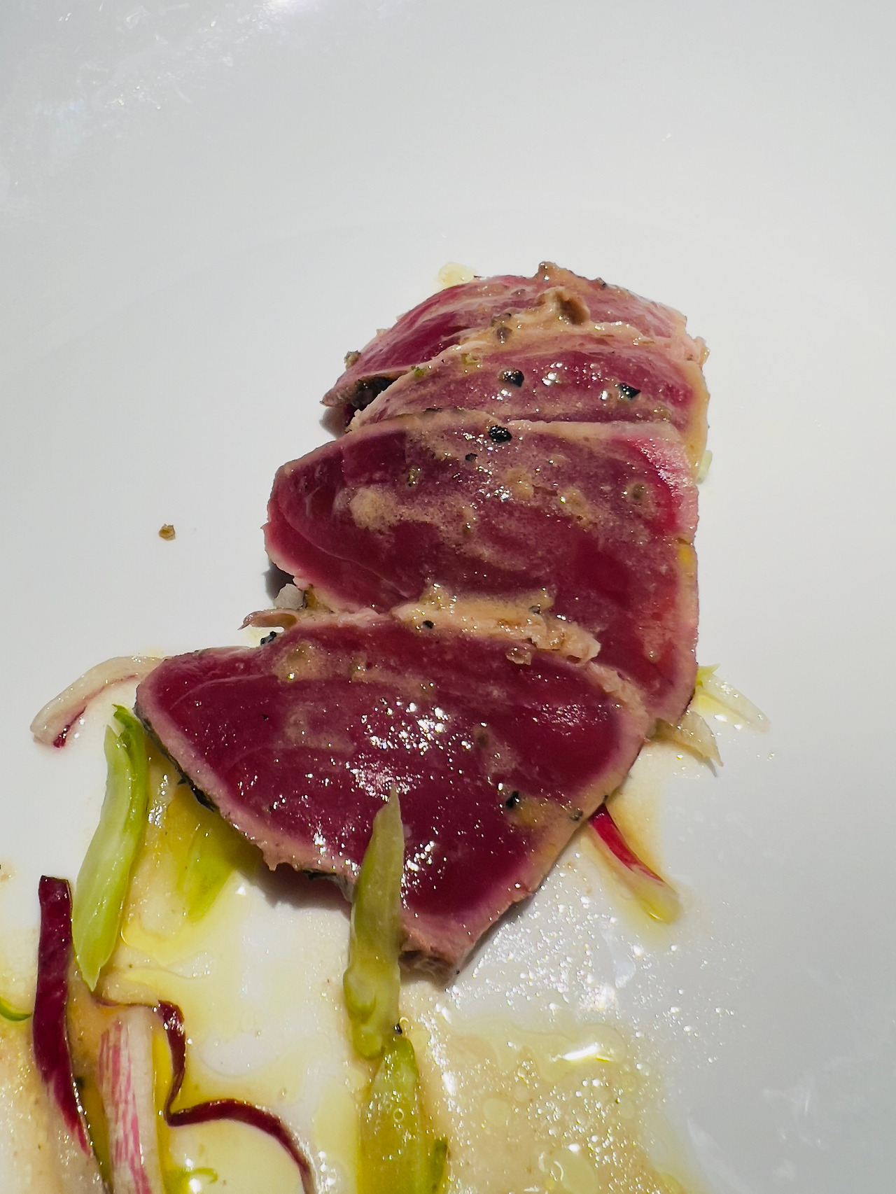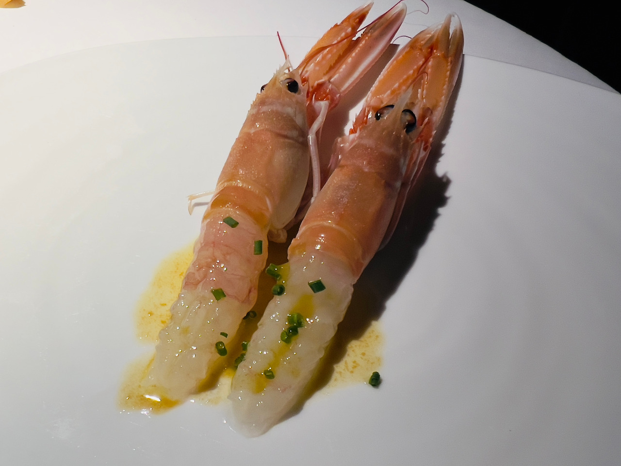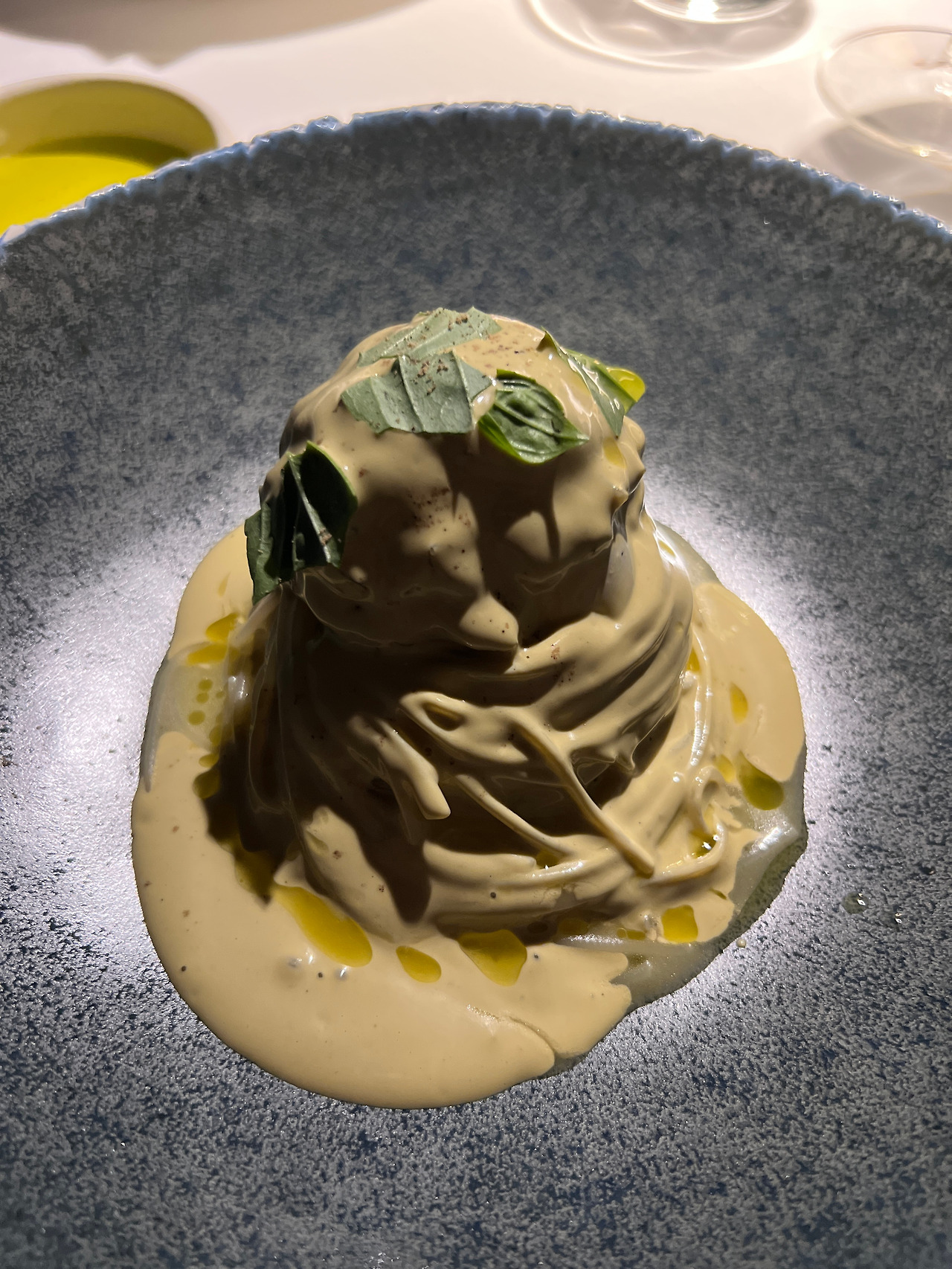 이곳의 시그니쳐는 - 놀랍게도 - 전채요리 안티파스토인 차가운 스파게티(Spaghettino Freddo)다. 30g 남짓의 스파게티노를 삶아 차갑게 식힌 후, 그 위에 깍둑썰기 한 루세르나 생선, 생새우 등을 다져 올리고 시칠리아 브론테산 피스타치오로 만들어낸 진득한 소스를 얹어낸다. 소스는 이미 말돈 소금, 봉골레 육수, 생강 오일 등으로 시즈닝 되어 엄청난 풍미를 자랑하고, 마지막에는 포베 델 그라파에서 공수한 '안개처럼 흐릿하고 신비로운 풍미'의 최고급 올리브 오일이 화룡점정을 찍는다. 첫 접시로 등장하지만 요동치는 거대한 감칠맛이 온 입안을 진동하기에 살짝 당황스럽기까지 하다.