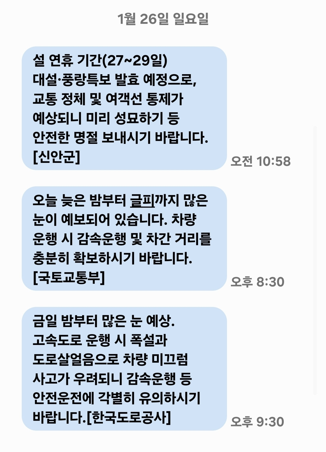 여객선 통젝 예상되니 미리 성묘를 하라는 문자와 폭설에 대비하라는 문자이다. 다리가 연결되기 전 명절을 앞두고 도시에서 내려온 자녀들이 풍랑에 배가 뜨지 않아 섬으로 들어가지 못하고 항구에서 차례를 지내고 고향 방향으로 절을 하고 다시 발길을 돌리는 일이 비일비재했다.
