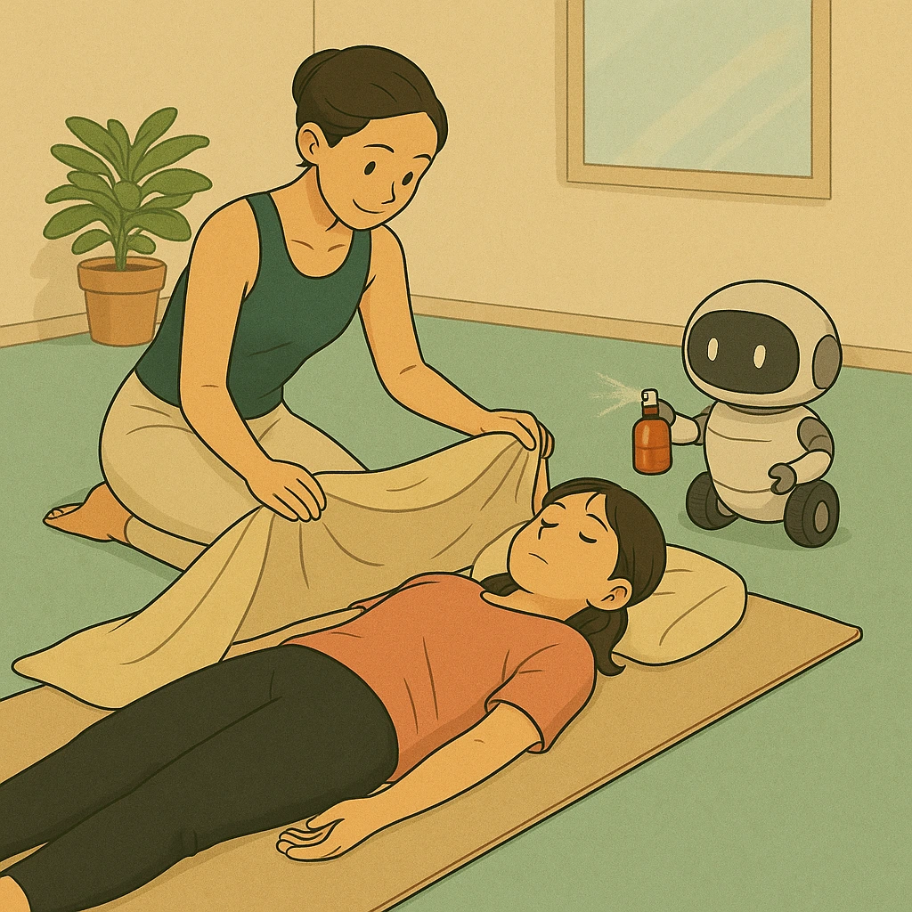 이런저런 생각을 하며 요가 매트 위에 누워있는 동안 선생님이 부지런히 돌아다니며 수련생 한 명 한 명에게 따뜻하게 이불을 덮어주고 라벤더 향 아로마 오일을 뿌려준다. 요가 선생님의 선하고 순수한 의도에 미소가 지어졌다. 그리고 그 옆에 강아지처럼 작고 귀여운 로봇이 졸졸 따라다니며 이불과 아로마 오일을 들고 선생님을 돕는 모습이 그려졌다.