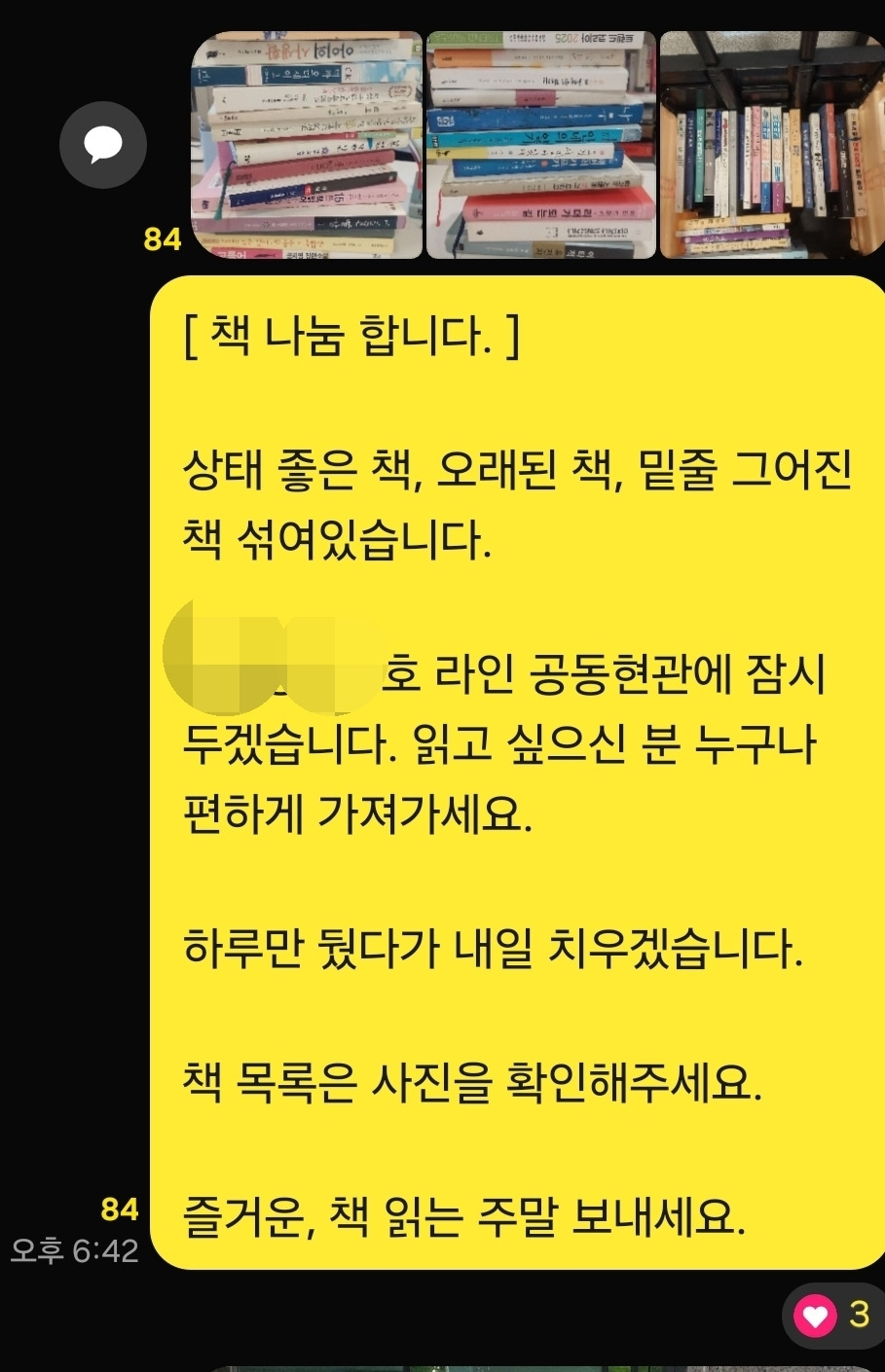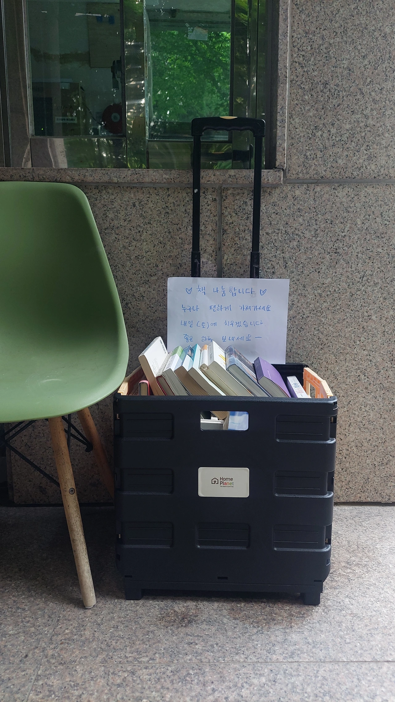 읽고 싶은 분 누구나 편하게 가져갈 수 있도록 공동현관 앞에 하루만 두겠다는 글을 아파트 단톡방에 올렸습니다.