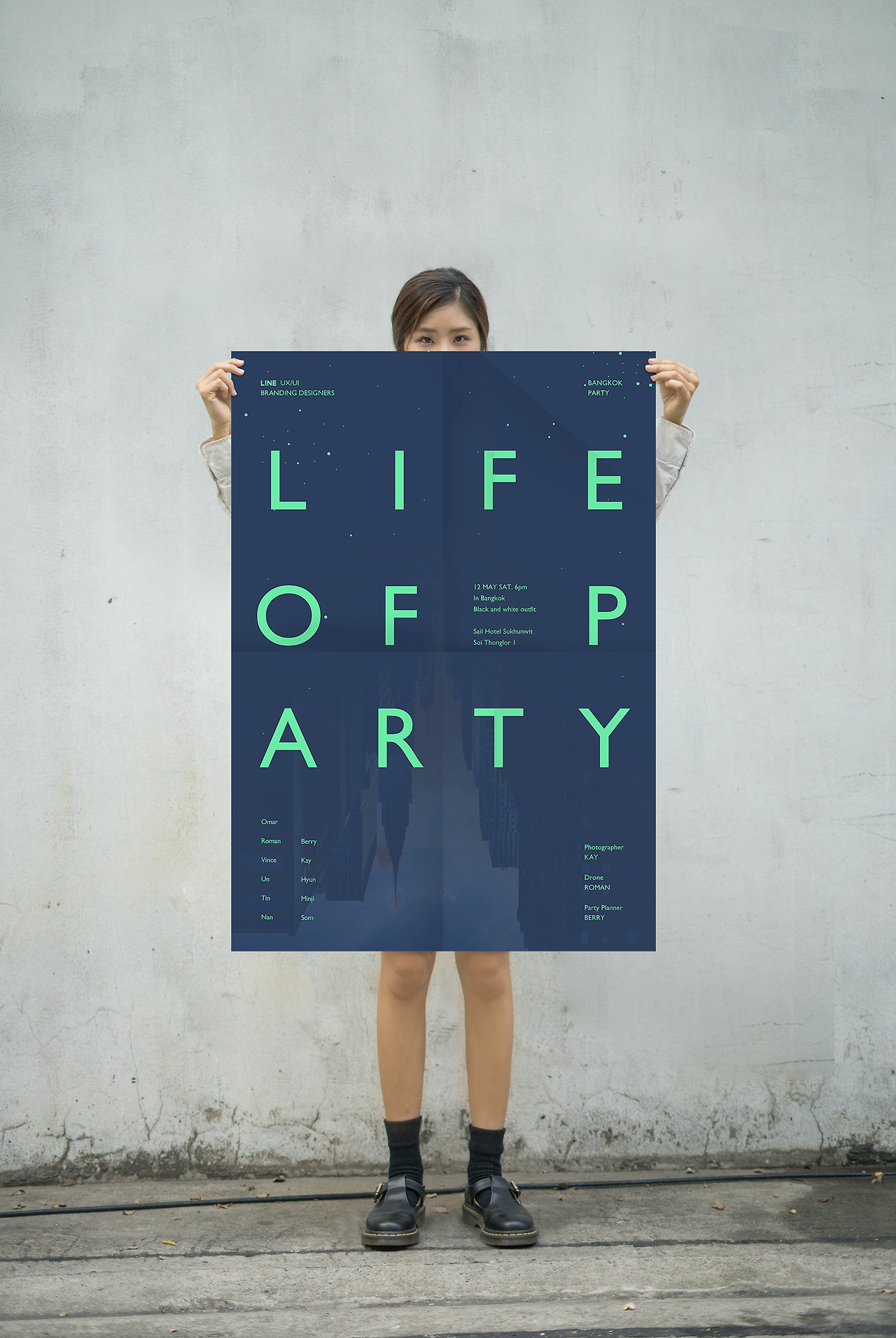 파티에 진지하게 임하고자 전체적인 컨셉을 'LIFE OF PARTY'로 잡고 Black&White의 드레스 코드, 그리고 컨셉에 어울리는 비주얼 포스터와 코스터도 제작하였다. 우리끼리만의 파티였지만, 제작한 포스터는 핫한 Thonglor street에 붙여 미리 홍보도 하였다. 이후 그 과정과 파티 장면은 Kimcity (방콕 스냅 작가 겸 디자이너 겸 남편)님이 영상 제작해주셨다.