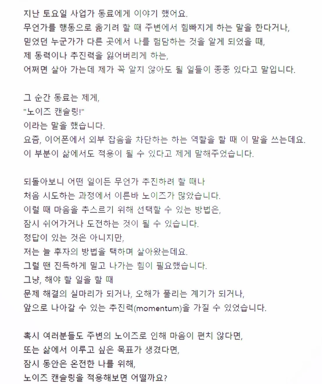 이 분을 만나기 직전, 아끼는 동생 지원이와 이야기를 나누며 우리의 키워드였던 ‘noise canceling’. 누군가에게는 위로가 되고, 그 누군가는 많은 사람들에게 이렇게 좋은 영향력으로 퍼져나간다.