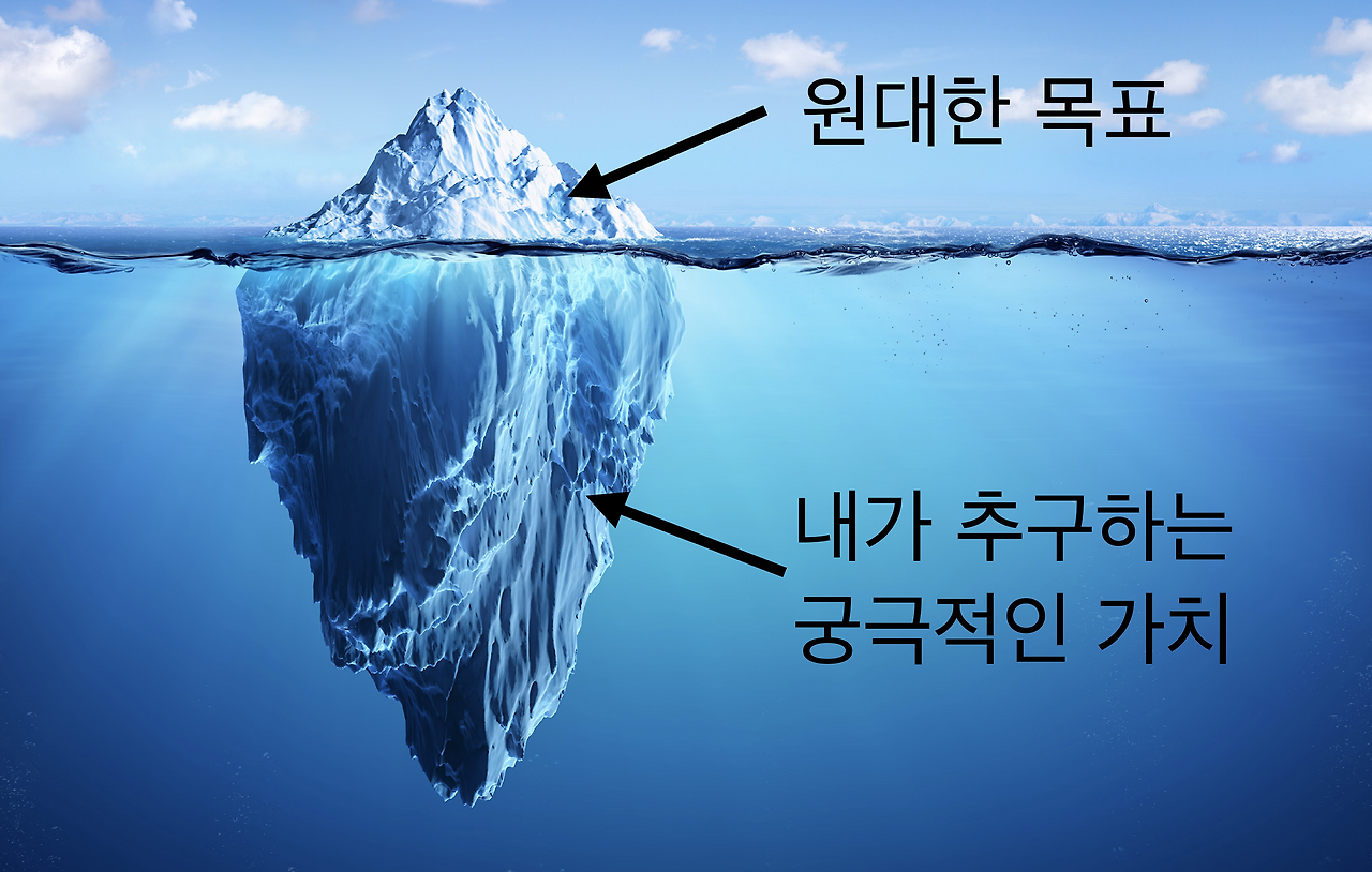 빙하의 윗부분인 원대한 목표를 지우면 겉으로 드러나는 부분이 안보이기에 꿈이 사라진 것 처럼 보인다. 하지만 사실 더 중요한 것이 빙하의 아랫부분을 지탱하고 있다. 그것은 바로 '내가 추구하는 가치'이다.