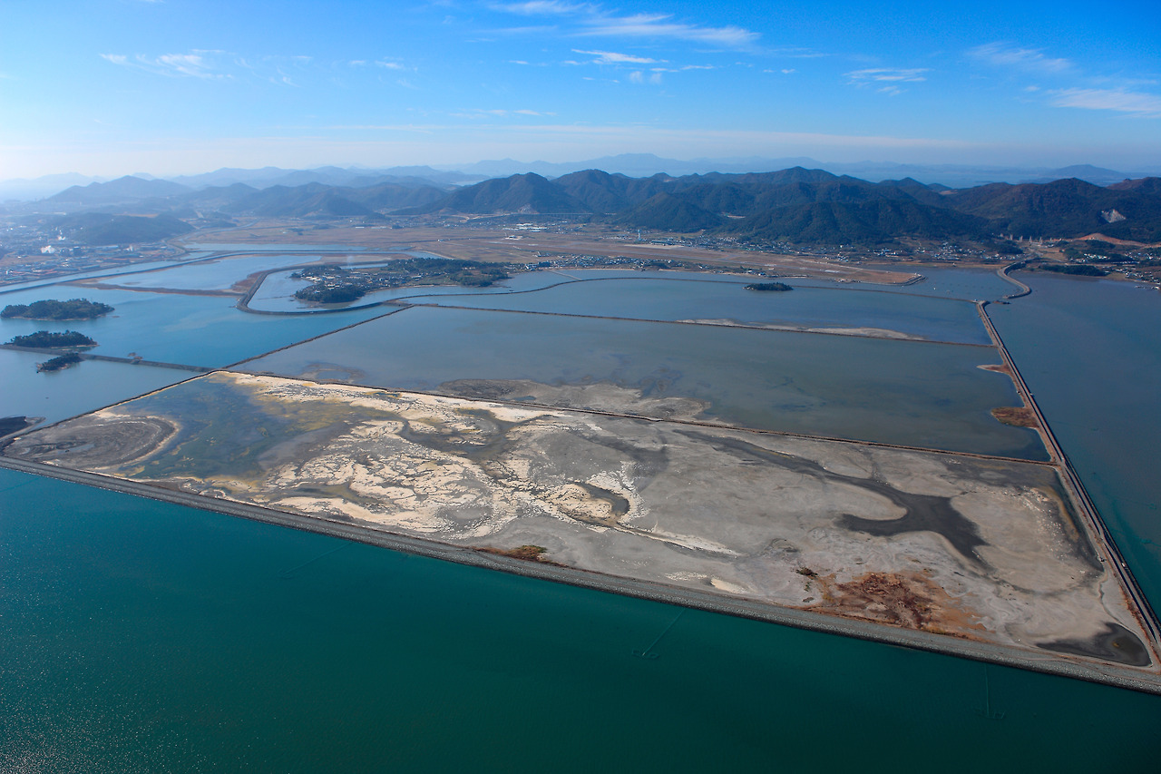 광양항의 조성사업 추진중(좌측), 완료후 전경(우측) 현재는 매립공사가 끝나고 정상적인 항만기능을 수행하고 있다.