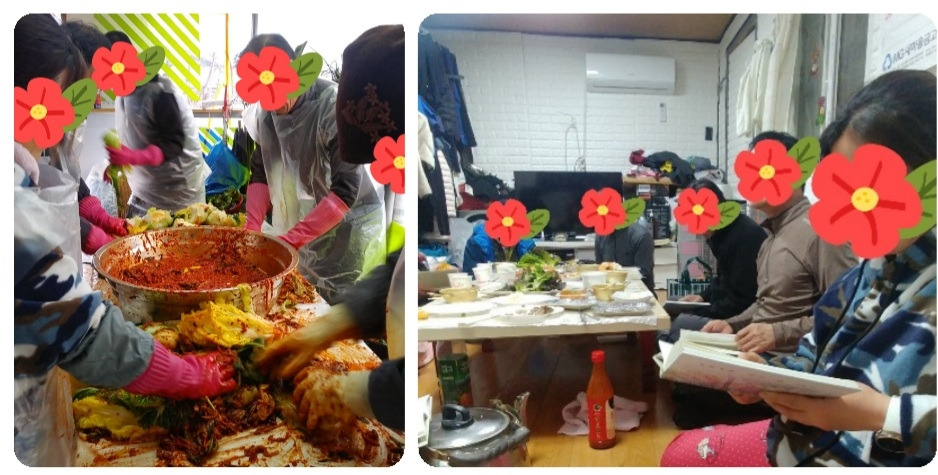 12월 초 토요일 오후 컨테이너 하우스에서 본격적으로 김장 담기를 시작하였다. 준비조가 절인 배추를 테이블로 옮겨다 주면 담그는 조는 꼼꼼하게 배추 사이사이에 양념을 바른 다음 김치통에 담고, 뒷줄에서 대기하던 운반조가 김치통 가장자리의 고춧가루를 닦아내고 뚜껑을 닫아 한쪽에 차곡차곡 쌓아갔다. 여럿이 협동하다 보니 산더미 같았던 배추는 어느새 김치로 변신하여 목적지를 향해 떠나갈 준비상태가 되었다.
