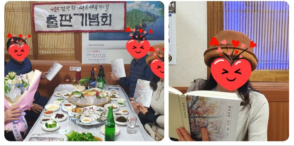 올여름에 현재 거주하고 있는 시에서 주관하여 원고가 책이 되는 프로젝트에 선정된 후 여러 협의 과정을 거쳐 11월 말 완성된 시집 《싸목싸목 걷는 길》을 직접 만나보니 자신이 기대했던 것보다 더 멋진 모습으로 다가왔다. 나름 신경을 꽤 썼기에 느끼는 감회가 남달랐다. 첫 발표회를 겸한 시 낭독회는 나의 여섯 남매가 모여 김장하는 날이었다. 그 모임은 이미 소개하였던 것처럼 남매들과는 자라면서 공감대가 형성된 부분이 많아 옛 추억을 소환하는 도구로써 소임을 충분히 한 셈이다.김장하던 날의 모임이 첫 낭독회라고 할 수 있겠다. 두 번째는 이 시집이 세상에 나오기까지 도움을 주신 분들과 만남이었다. 문예대학 전담강사로 프로젝트에 참여하라고 적극 용기를 불어넣어 주신 분, 시집 표지와 내지에 실린 그림 사진을 제공해주신 분, 멋진 시집의 탄생을 감수해주신 분 등이다. 이날의 만남은 시내의 조용한 횟집이었는데 운초 화가께서 예고도 하지 않고 꽃다발과 출판을 축하하는 아담한 현수막을 한지에 써오셨다. 꽃다발을 받은 기분이 쑥스러웠으나 감사히 받았고, 준비해오신 멋진 서체의 현수막은 식당 사장님의 양해를 얻어 벽에 붙이고 참석자 넷이서 기념사진도 찍었다. 사장님도 왕년에 출간 경력이 있는 분으로 멋지게 사진을 찍어 주셨다. 그리고 참석하신 분들이 차례로 ‘서예’, ‘선암사의 유월’, ‘무소유 길을 걸으며’, ‘가위질’ 등을 차례대로 낭독하였다. 이런저런 대화를 나누며 유쾌한 한때를 보냈다. 서예 이정표도 없는 산길 작은 암자에 올라 운신의 좌표 그려보고 싶을 때 흑백의 세계가 동경이 되어 뭉클해졌다 숲 속 고요를 품은 송연(松煙) 조심히 갈아놓고 새로 스쳐 갈 소중한 인연 기다림으로 담백한 만남 떠올리며 눈을 감는다 한 획의 흔들림이 두려워 호흡이 멎고 초심을 한 자 옮김이 어찌 태산보다 가벼울까 어느덧 공간은 묵향으로 채워지고 저 우주의 명멸하는 별빛 속에서 전설의 위인이 다가와 귓가에 소곤거리는 명언들이 약속한 여백 남기고 자리 잡기 시작한다 보이지도 잡히지도 않지만 바람처럼 존재 인식함으로 세상 시간 위 소망하는 사유들을 잊게 한다 잎사귀 떨구어 낸 겨울 나뭇가지 흔들리듯 붓끝에 걸린 떨림이 문득 통쾌하여라 며칠 후 문인협회 주관 문예대학에서 함께 수학하신 문우 두 분과 자리를 함께하였다. 그중에 한 분은 이번 프로젝트에 같이 선정되어 시집을 출간한 분이었다. 그동안 자신의 시집을 출간하지 않았을 뿐 이미 기성 시인이나 진배없는 실력가들로 두 분 모두 시 낭송을 감동적으로 잘하시는 분들이다. 저녁 식사를 끝내고 장소를 옮겨 순천에서 여수로 내려가는 서쪽 길목에 자리한 순천만의 와온 해변의 찻집을 찾아갔다. 시정(詩情) 분위기를 함께 느끼고 싶었기 때문이었다. 그러나 어려운 시국 탓인지 일찌감치 영업을 끝내고 불이 꺼졌고 하늘은 보름이 이틀 정도 지난 시점이라 달은 하현을 향해 가고 있었다. 칠순이 훌쩍 넘으신 최 시인님으로부터 바다 건너 새우양식장과 옛날에 이곳 남정네들은 와온 바다 뻘을 헤집고 한 뼘 크기의 솔섬 주막으로 밤 나들이 다녔다는 사연을 들었다. 외부로부터 자연으로 차단된 갯벌 위의 작은 섬이 어쩌면 시절 낭만이었을까. ‘와온의 꿈’과 시간들에 대하여 이야기를 나누다가 돌아왔다. 와온의 꿈 Ⅰ 인적 드문 와온 뻘 건너 정령처럼 저녁 햇살 타고 다가오는 코끝 시린 동지섣달 갯바람 무리들 잰걸음 열정 내려놓고 땀구멍 닫아버린 침묵하는 태양은 바닷가 나지막한 산마루 걸터앉아 시간 속에 개어 넣고 되새김하는 추억 작은 심장 열고 스쳐 간 생명들이 남겨놓은 무작위적 발자국 따라 걸으면 어느덧 시작되는 겨울 소나타 마른 꽃잎들은 깃털이 되어 바람처럼 흔적 없이 흩어지는데 저 앙상한 갈대 줄기에는 작은 소망 하나씩 끈질기게 매달려 있다 순천에 내려와 살면서 호형호제하며 가깝게 지내게 된 후배가 세 명 있다. 그중에 두 명을 주말에 만났다. 평소에도 가끔 만나 식사도 하고 차도 마시는 관계로 허물이 없다. 이들은 시집에 등장하는 ‘숨바꼭질’의 주연과 조연자이다. S가 어느 날 주차 중에 차 안에서 우연히 H를 목격하고 그 일을 나에 소상히 밝혔는데 그게 너무도 웃겼다. 한 번은 그 문제의 장소 가까이에서 모인 적이 있어서 현장 상황을 제대로 파악할 수가 있었다. 주연 H에게 시집 두 권을 건네주며 ‘숨바꼭질’을 낭독하게 했다.그리고 유쾌한 웃음을 나누었다. 우리의 인연은 오래오래 그렇게 갈 것이다. 숨바꼭질 가로등이 무료해질 시간을 쫓아 밤이슬이 가로수 잎에 내려앉는 동안 친구는 불 켜진 스마트폰으로 허공에 초승달을 그리는 중이었다 불 꺼진 아파트 베란다에서 애틋한 눈빛이 반짝거릴 때 저 술래들의 소리 없는 대화가 등나무 아치 그늘 아래 차곡차곡 쌓인다 간절한 사랑의 훼방꾼이 될 수 없어 숨을 죽이고 지켜보던 그는 바람에 흔들리는 불빛만 안타까운 마음으로 붙들고 있었다 내가 현재의 직장에 머무르는 시간이 제법 흘렀다. 그동안 많은 이들과 어울리며 다양한 사연들을 쌓았다. 당연히 얻은 것도 많고 또 아