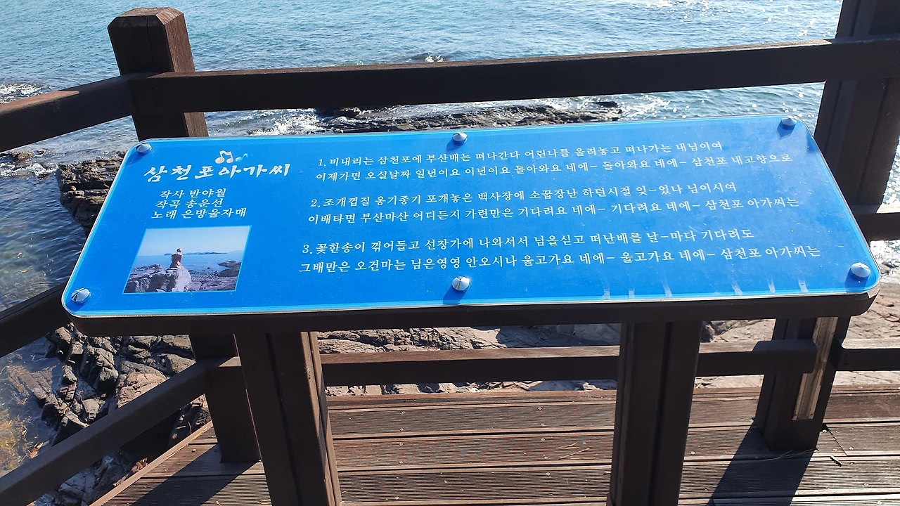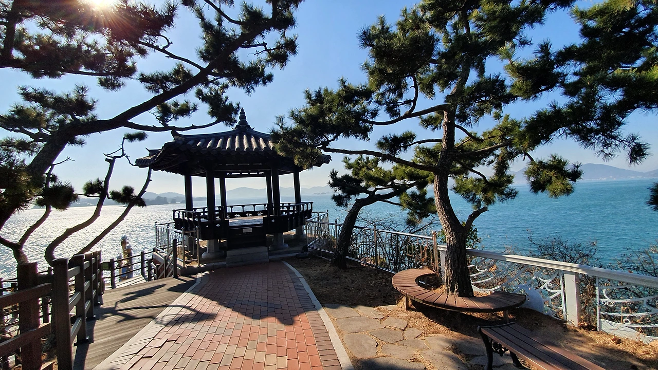 산책로를 따라 내려오는 길목에 소나무 숲 사이로 아름다운 정자가 바다에서 불어오는 해풍 속에 의연히 서 있다. 해변에는 「삼천포 아가씨」의 노랫말과 가사에 나오는 아가씨가 갯바위에 앉아 아직도 돌아오지 않은 임을 한없이 기다리고 있었다.