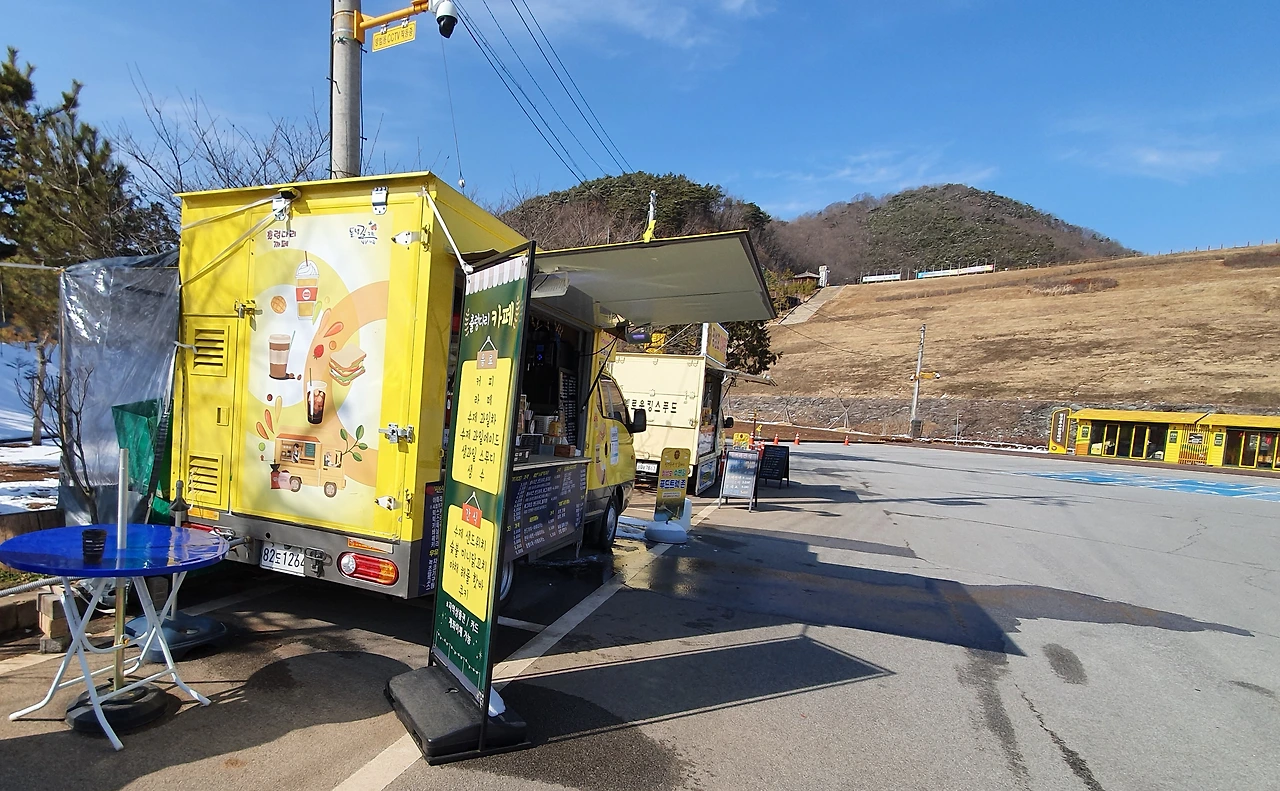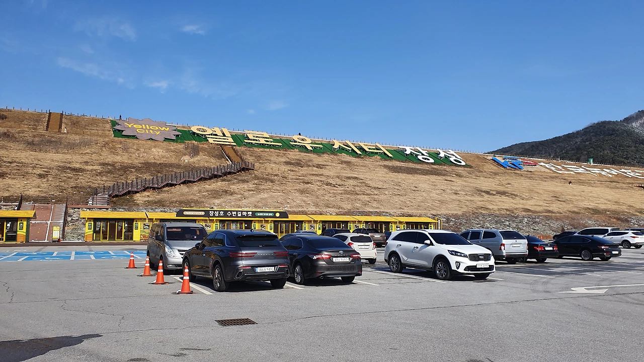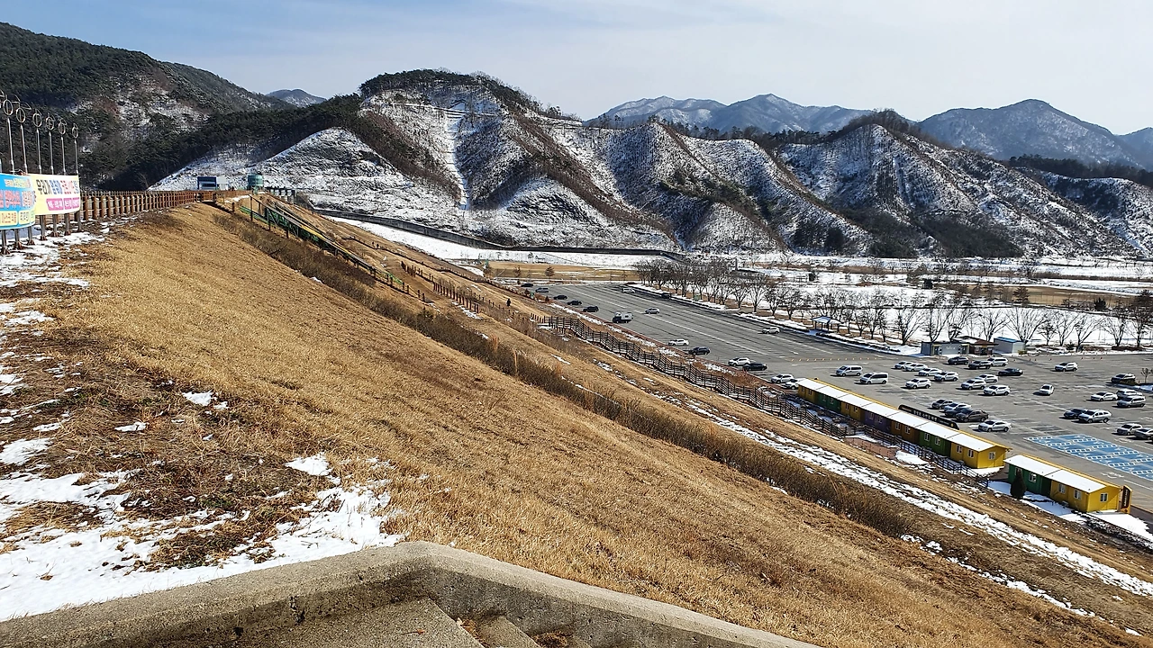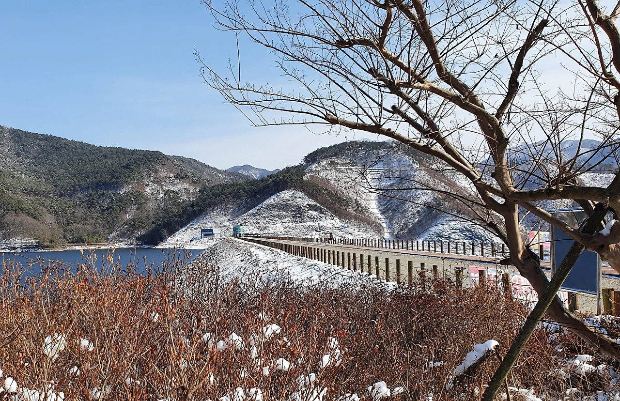 장성댐 아래 주차장에 도착해보니 제법 넓은 주차장이 많이 비어 있다. 댐 주변의 산골짜기에는 서해안이 가까운 탓인지 밤새 많이 내린 눈이 녹지 않고 하얗게 내려앉아 쓸쓸한 겨울 풍경을 연출하고 있었다. 다양한 농산물이나 먹거리를 파는 가게가 줄지어 서 있었지만 오늘은 커피나 호빵, 어묵 등을 파는 가게 두 곳만 영업 중이다. 따끈한 차 한잔을 들고 광장에서 댐 둑을 향해서 긴 계단을 걸어 올라가는데 바람이 불어와 제법 쌀쌀하다. 옷을 단단히 입긴 했어도 아직은 겨울의 끝자락임을 실감케 한다. 처음으로 올라와 보는 장성댐이 위용이 놀랍다.