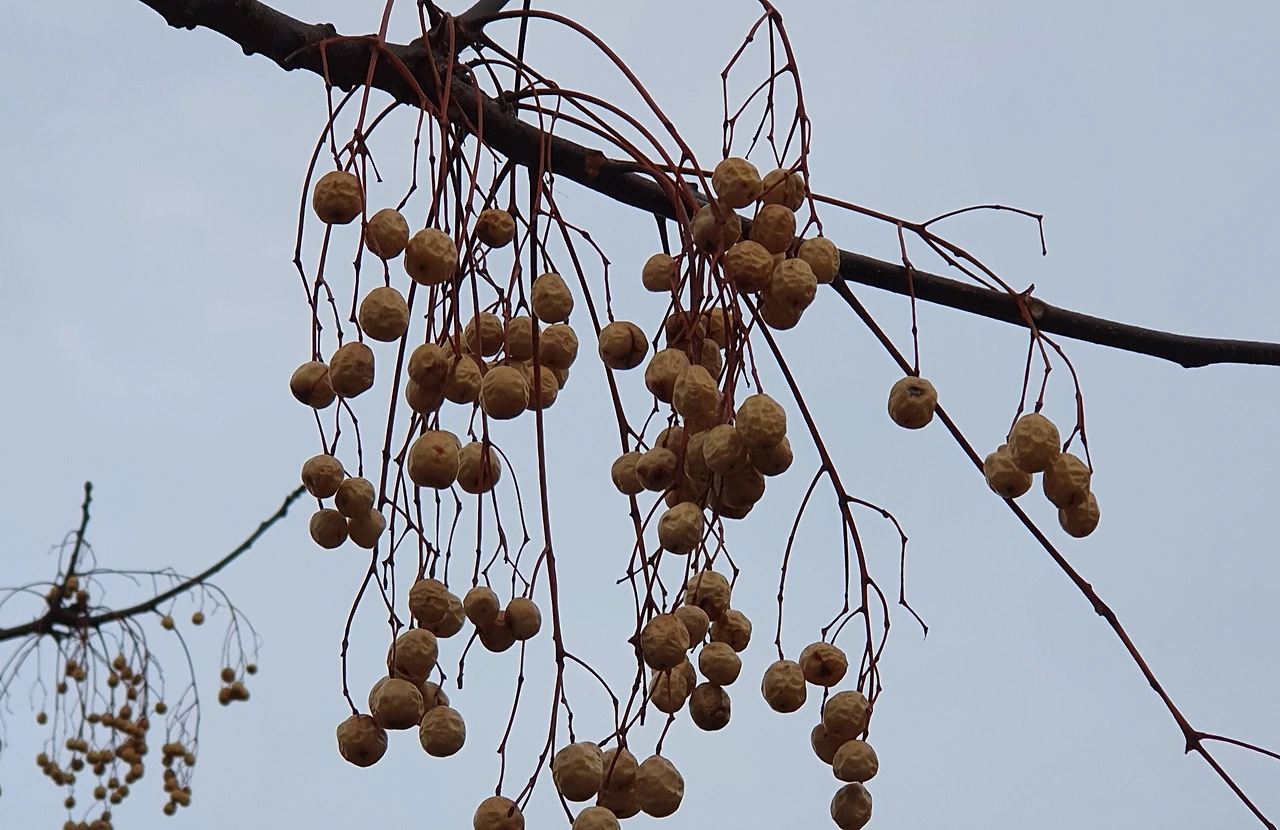 강가의 고롱나무에 마른 멀구슬 열매가 매달려 있다