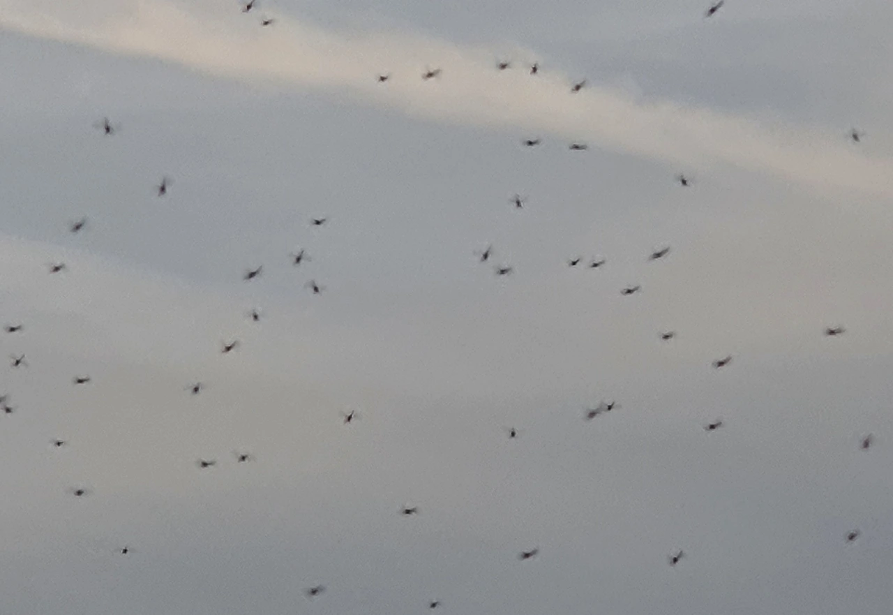 노을 속으로 뭉쳐져 사라지는 하루살이 떼를 만난 현장 사진