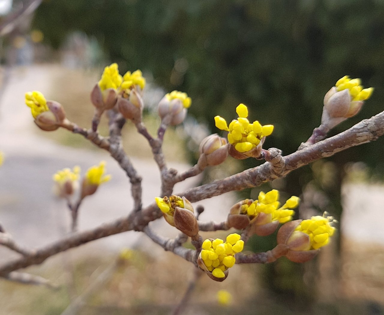 이제 막 노오란 산수유 꽃봉오리가 열렸다