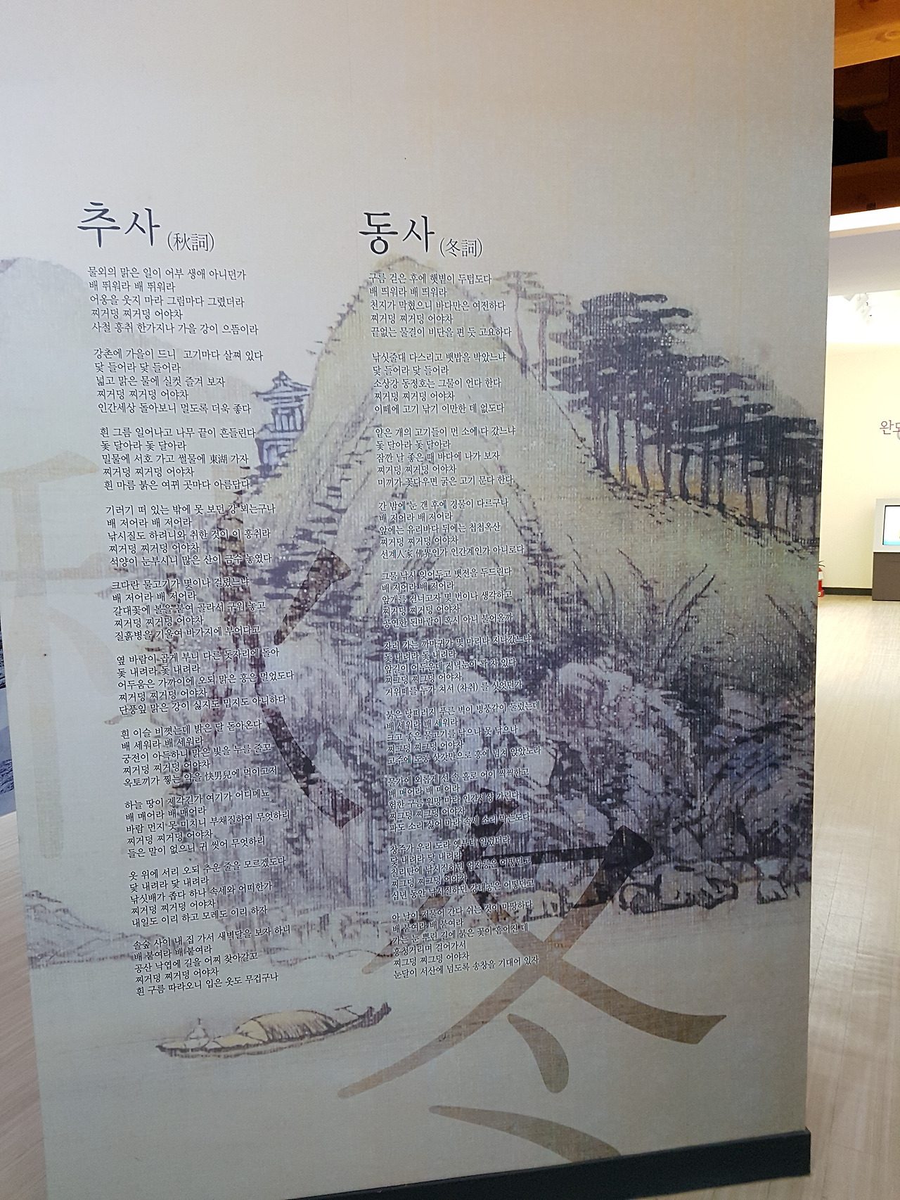 보길도는 고산(孤山) 윤선도(尹善道)의 어부사시사로 명성을 얻어 많은 이들의 발걸음을 머물게 하는 곳이기도 하다. 잠시 문학관에 들려 시간을 거슬러 올라가 그를 만나본다. 봄과 여름과 가을, 그리고 겨울, 고산의 신산했던 인생의 고비 고비마다 보길도는 그 마음의 안식처로서 적지 않은 역할을 톡톡히 하였음을 느낄 만큼, 그것을 대변해 주는 공간들이 섬 곳곳에 산재한다. 보길도의 땅끝 전망대에서 먼 바다를 바라보다가, 문득 고산은 얼마나 많은 사색과 고뇌를 거듭하였을까. 그의 이력을 통해 타협보다는 자신의 의지를 더 세움으로써 스스로를 고립무원으로 이끈 것은 아닐까 하는 생각도 들었다.