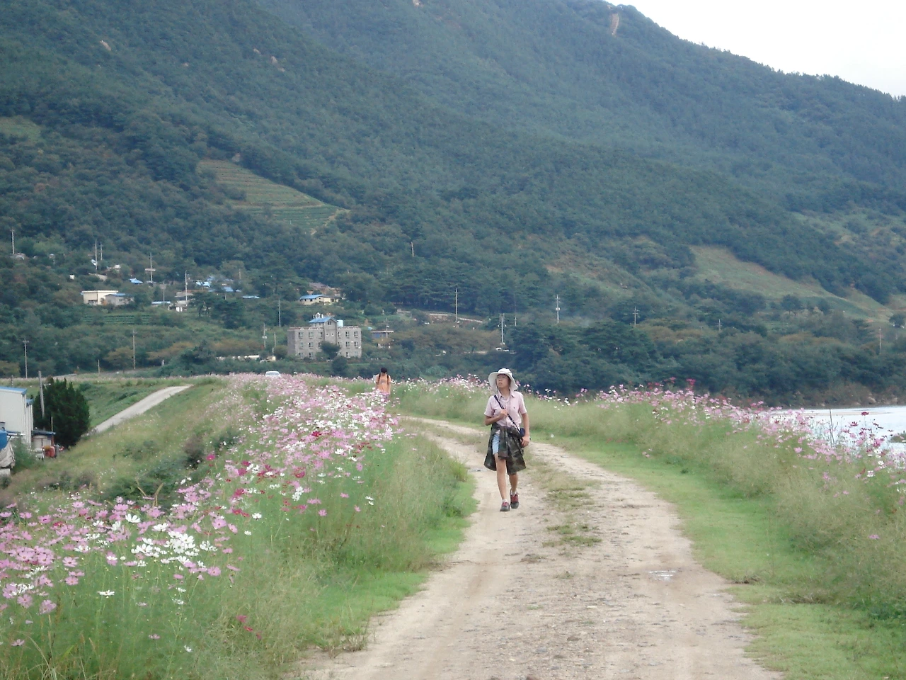 17:30 코스모스 피어있는 길 19번 국도와 섬진강 둑방길이 갈라지는 길이 나타나자, 갑자기 애들의 환호성이 하늘을 찌른다. 코스모스가 한들한들 피어있는 길이 나타났기 때문이다. 우리는 당연히(?) 둑방길을 택했다. 1km쯤 됨직한 둑길 양편에는 흰색, 파랑, 분홍, 심지어는 검붉은 색의 코스모스가 만개했다. 코스모스 뒤로는 여전히 섬진강이 내려다보인다. 싱그러운 가을의 정취를 한껏 느끼며 우리들은 천천히 길을 따라간다.