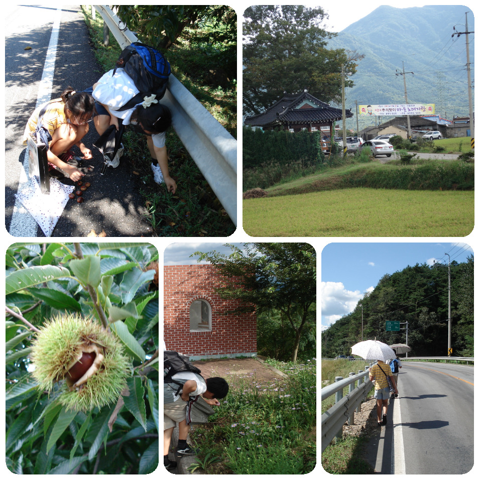 14:00 밤을 주워 담고 한참을 걷다 보니 알밤들이 제대로 영글었는지, 밤송이 사이로 터져 나온 놈, 도로 위에 떨어져 널려있는 놈... 토실토실하게 잘 여문 알밤들이 보기에도 옹골지다. 누가 먼저랄 것도 없이 배낭에 주워 담기 10여 분만에 배낭 주머니에 꽉 찬다. 잘 생긴 놈 하나를 집어 이빨로 껍질을 벗겨내고, 와삭와삭 씹어 먹으며 애들한테 한마디 던졌다. 예전에 군것질할 게 별로 없던 시절에는 참 맛있게 생밤, 군밤을 먹었었노라고. 하긴, 어디 밤뿐이랴. 보리 서리, 수박, 복숭아, 고구마, 감자, 개구리 구이 등등 이것들이 더없이 좋은 간식거리였다. 하굣길에는 길가에 있는 무 하나씩 뽑아 들고 훌렁훌렁 껍질을 벗겨 우걱우걱~ 먹는 맛을 너희들이 알랴.