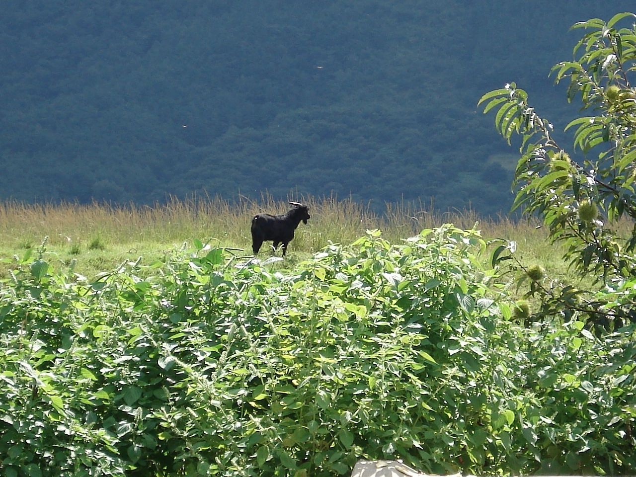 강둑에 매어둔 흑염소가 한가롭게 풀을 뜯고 있다