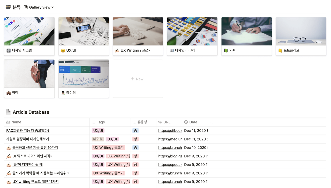 읽는 데 시간이 많이 소요되는 책보다는 출퇴근길이나 쉴 때 스마트폰으로 쉽고 빠르게 읽을 수 있는 아티클을 많이 읽게 된다. 일을 시작하고 스무 살 때부터 아티클을 읽기 시작했는데 그동안 크롬 즐겨찾기에 보관하다가 올해부터는 노션으로 기록하고 있다. 필요할 때 찾아볼 수 있도록 도움이 될 만한 글들을 기록을 하고 있고, 중요하다고 생각되는 글은 요약정리까지 하고 있다.