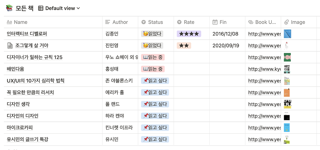 아주 어렸을 때 아이북랜드를 통해 책을 읽던 것 말고는 책과 그리 친하게 지내지 않았던 것 같다. 1년에 한두 권 정도 읽어왔던 것 같은데 디자인에 관한 지식과 글쓰기에 도움이 될 것 같아서 독서량을 늘려보려 한다. 마침 기록하기 좋은 노션이 있어서 읽은 책과 읽고 싶은 책들을 기록하고 있다. 아무래도 디자인 관련 책들이 많다.