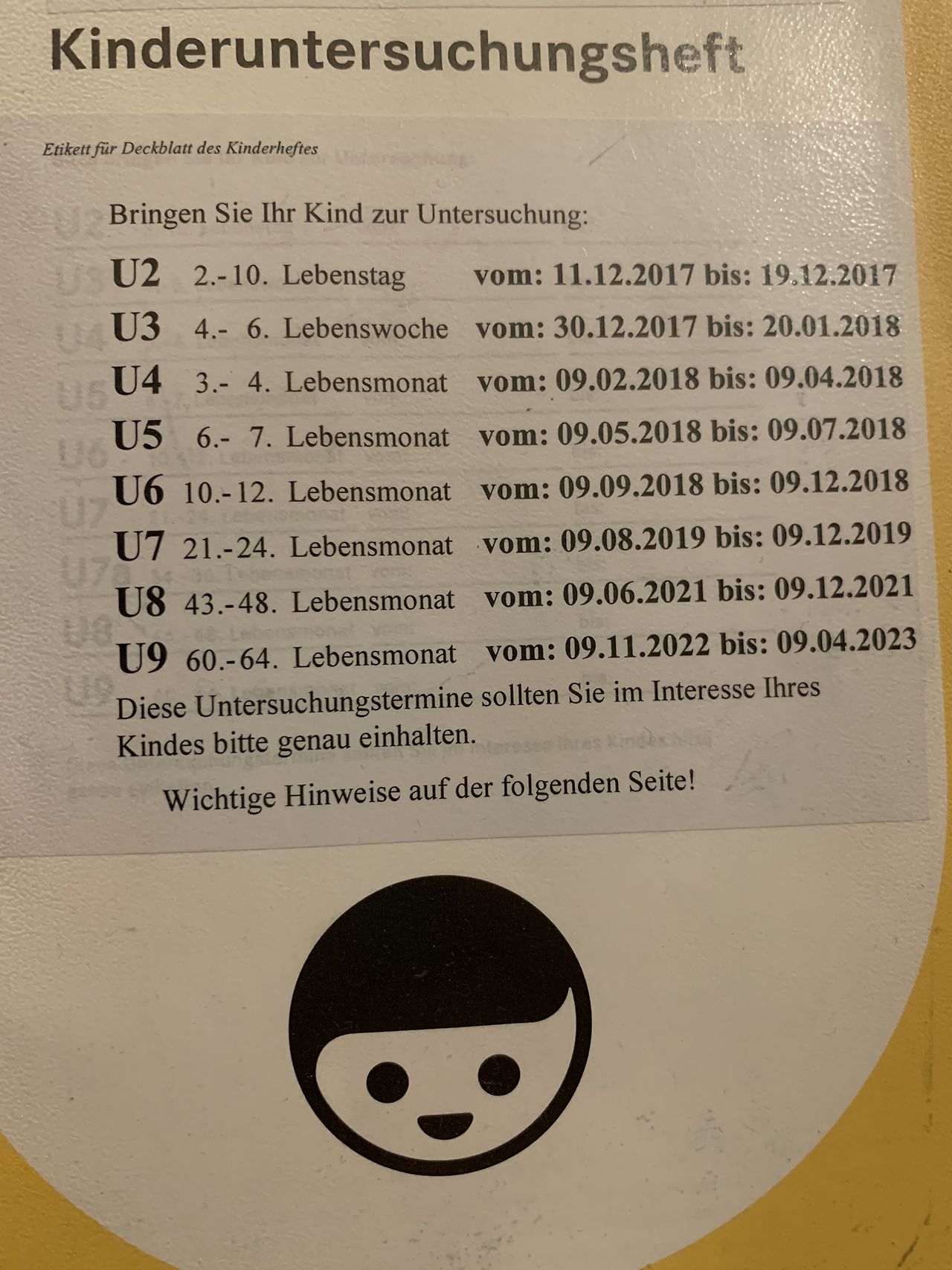 독일은 아기가 태어나면 병원에서 검사받은 기록이 담긴 노란 책(Gelbebuch겔베부흐)과, 작은 예방접종 수첩을 모든 아이에게 준다. 아이가 다니게 될 소아과도 미리 정해 둔다. 노란 책 겉표지에는 개월 수에 맞는 영유아 검사 날짜와 연도가 있다. 생후 12개월까지는 머리둘레, 몸무게, 키, 뒤집기 등 검사를 한다. 한 살 이후에는 언어 검사가 추가되며 팔자걸음, 안장 걸음을 검사한다. 영유아 검사 날에는 그 개월 수에 맞는 예방접종도 함께한다. 초등학교 저학년 때까지 소아과를 다니며 검사받는다.