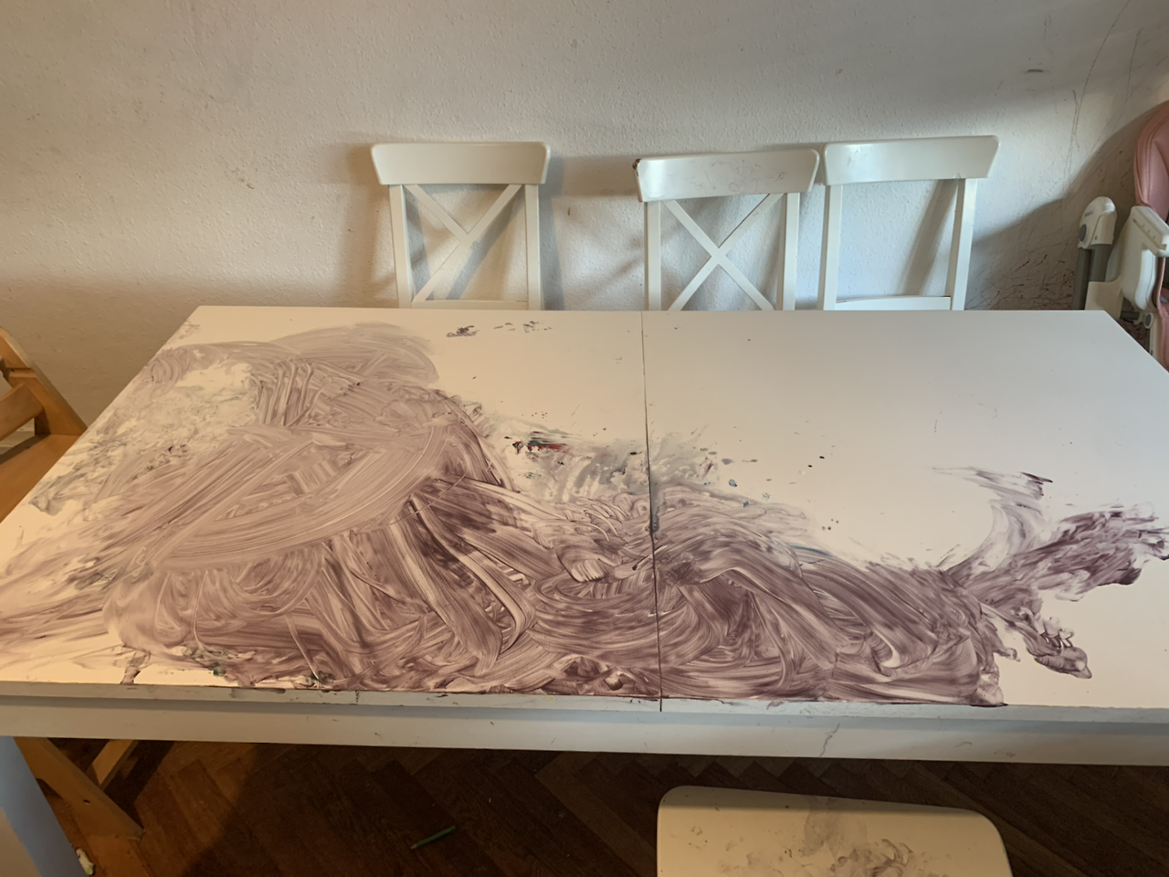 셋째는 자라며 두 극성맞은 오빠들의 영향을 많이 받았다. 겁 없이 높은 곳도 순식간에 올라가고 미끄럼들도 엎드려서 타고 내려왔다. 모래에 얼굴이 처박혔고 입에든 모래를 씹어 먹었다. 비눗방울 놀이를 한다며 화장실에서 '호호' 불었는데 얼마 못 가서 우당 땅콩탕 소리가 들려왔다.'비눗물을 바닥에 쏟아부었겠구나 그 위에서 스케이트를 타겠지?' 문을 열어보니 내 예상은 적중했다. 그 와중에 둘째는 "엄마, 핸드폰으로 찍어." 란다. 그뿐인가 그림 그리자는 녀석들의 성화에 못 이겨 스케치북을 여러 장 뜯어서 식탁에 깔아줬다. 막내딸에게 새로운 경험을 해 주고 싶어서 물감을 꺼냈다.