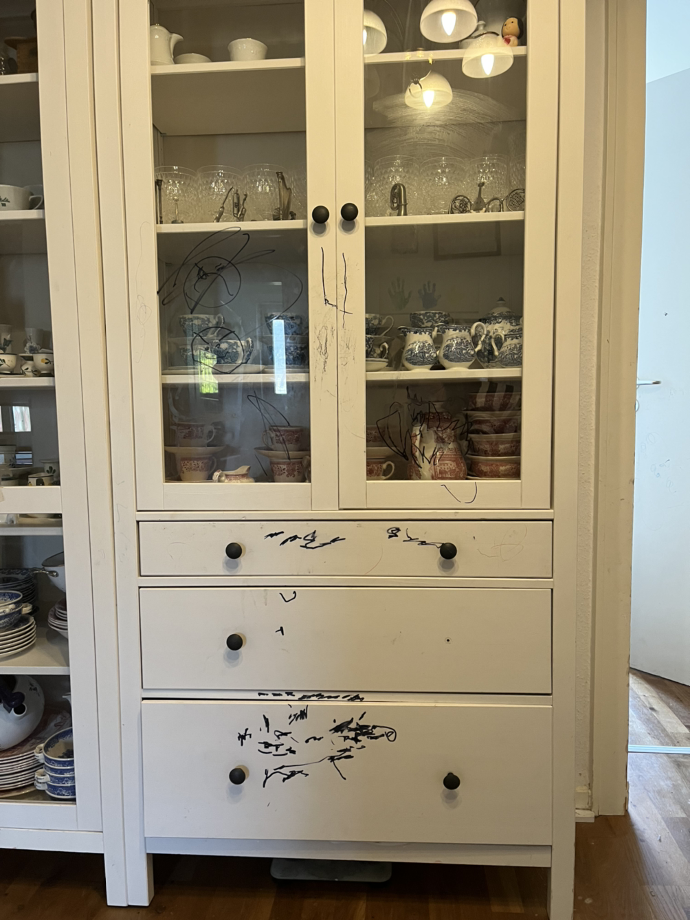 셋째를 임신했을 때 내 친구는 "셋째는 둘째보다 조금 얌전한 아이를 주실 거야" 라며 날 위로했다. 그러나 셋째도 대단했다. 하얀색 찻장에 검은색 매직으로 멋지게 그림을 그렸다. 예쁜 찻잔을 돋보이게 해 주던 찻장이었는데. 눈물이 와락 쏟아져 내릴 것 같았다. 세면대에 물을 받아 새 기저귀를 투척하기도 했다. '기저귀 값도 한 두 푼이더냐.' 울분을 삼켰다.