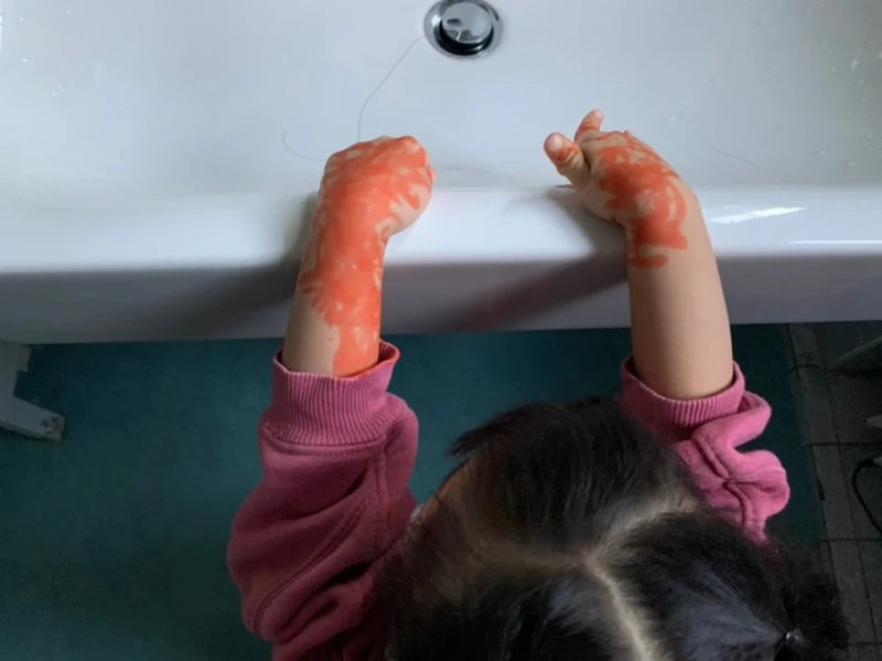 셋째를 유치원에 보내려고 예쁘게 단장해 주었는데. 주황색 형광펜을 양손에 꼼꼼하게 칠했다. 비누로 지워보지만 색은 옅어졌을 뿐 더 지워지지 않았다. 색도 골라도 주황색이었는지 피부병에 걸린 것처럼 보였다. 아니나 다를까 유치원에서 전화가 왔다. "다희 손이 왜 이래요? 피부병인 것 같아요 병원에 가봐야겠어요." "등원 전 그림을 좀 그렸어요. 자세히 보시면 알 거예요." "하하하 그러네요." 라며 전화가 끊겼다. 내 얼굴은 화끈거렸다.