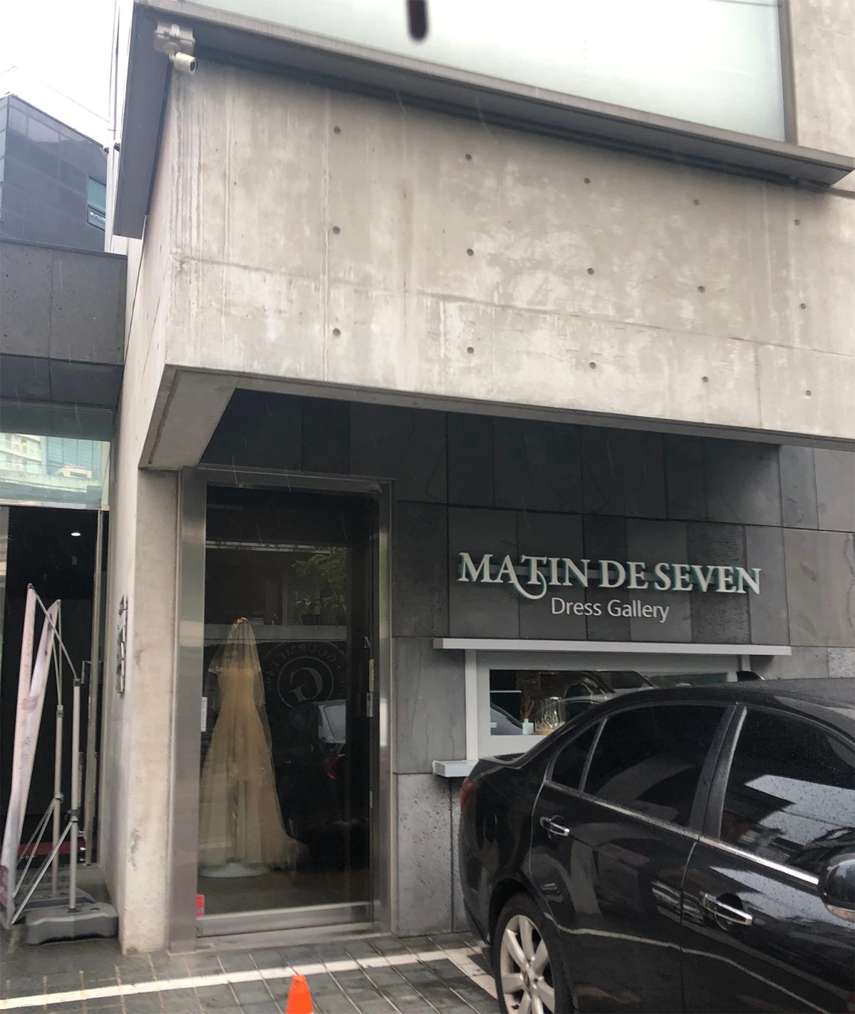 플래너의 신신당부를 잊지 않고, 오늘만큼은 늦을 수 없기에 반차를 쓰고 일찍 나왔다. 다행히 회사에서 청담동이 멀지 않았지만, 행여나 늦을까 퇴근하자마자 서두른다. 반면 직장이 먼 여자친구는 하루 연차를 쓰고 일찍이 집에서 나와 시간에 맞춰 청담동으로 건너왔다. 2시 되기 5분.. 을 남기고 드레스 스튜디오에 겨우 도착. 첫 번째 드레스 샵은 마틴드세븐이라는 곳이다.