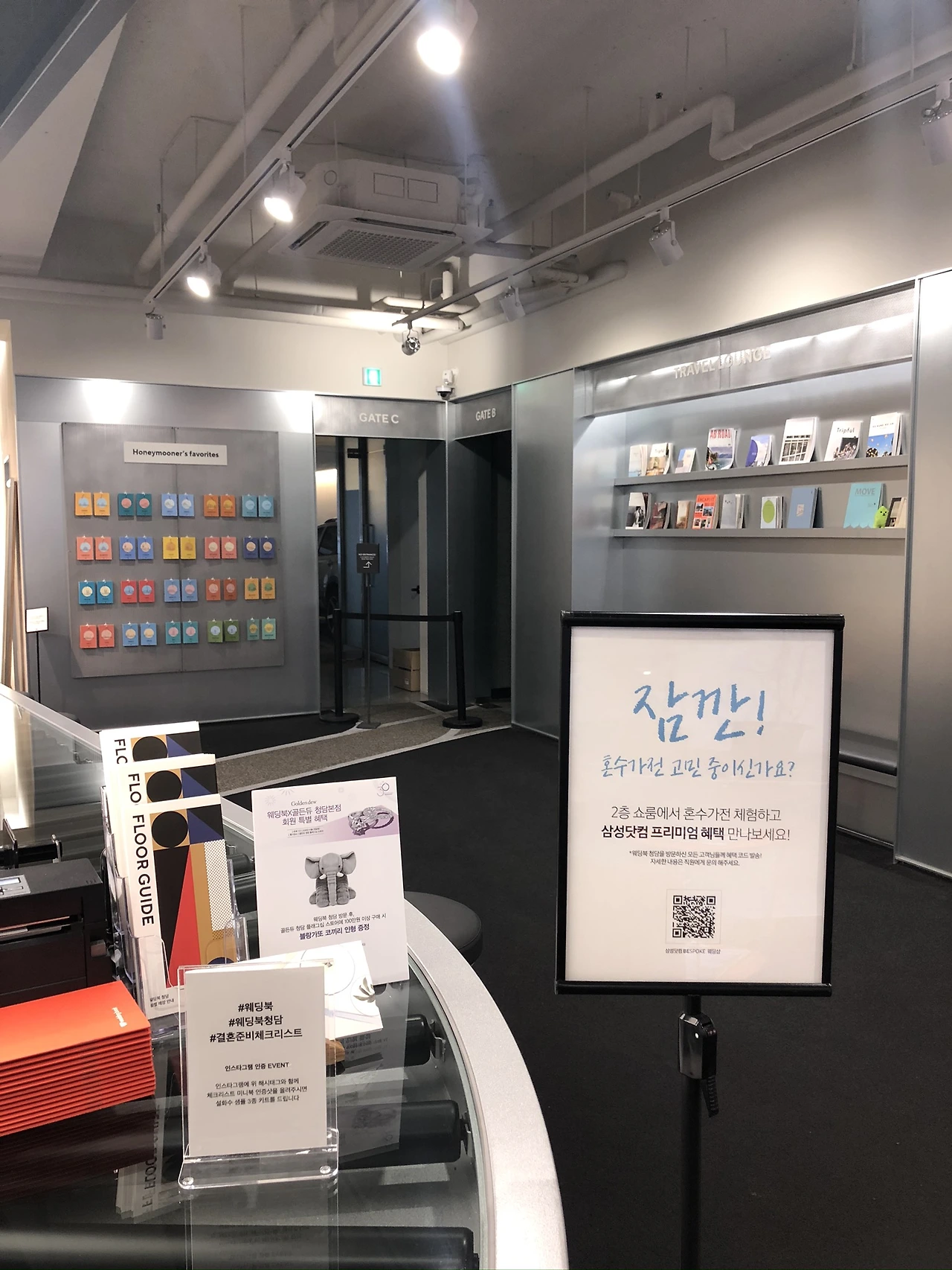 마틴드 세븐에서 나와 둘 다 어리둥절하다. 휴. 나름 한 시간 동안 긴박하게 지나간 순간들. 이 일련의 행동을 오늘 두 번 더 진행해야 한다. "다음에는 더 익숙하겠지" 라며 서로 응원의 말을 건넨다. 다음 투어 시간까지 약간의 시간이 남았다. 두 번째 드레스 샵인 라포엠으로 이동하기 전에 미리 봐 두었던 '웨딩북'에 잠깐 들러보기로 했다.