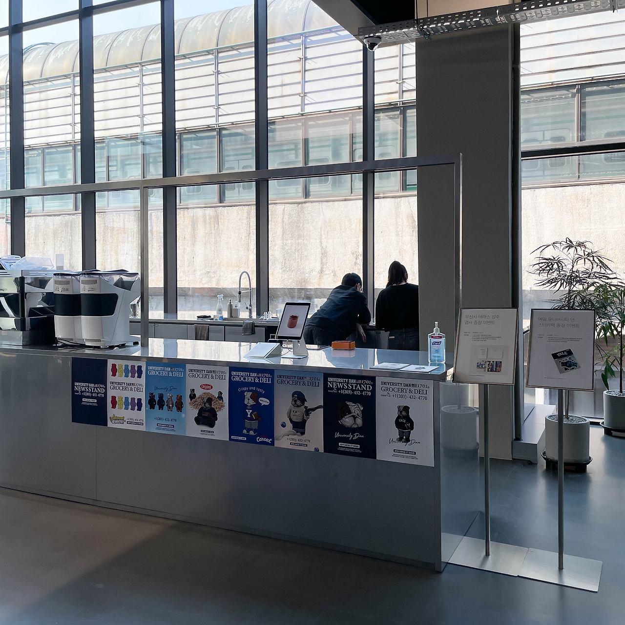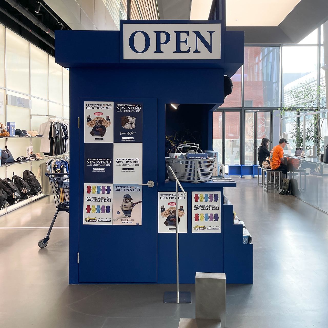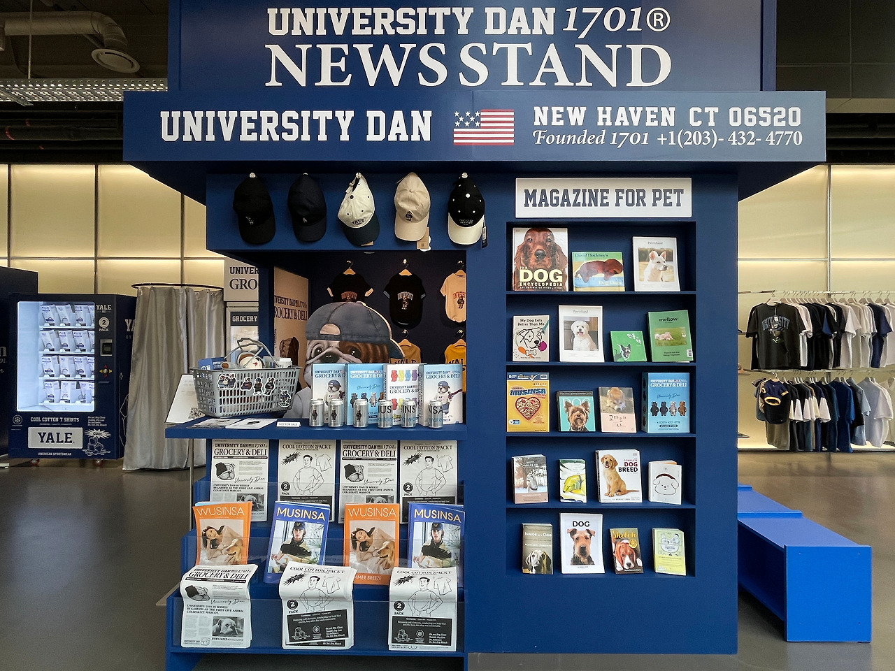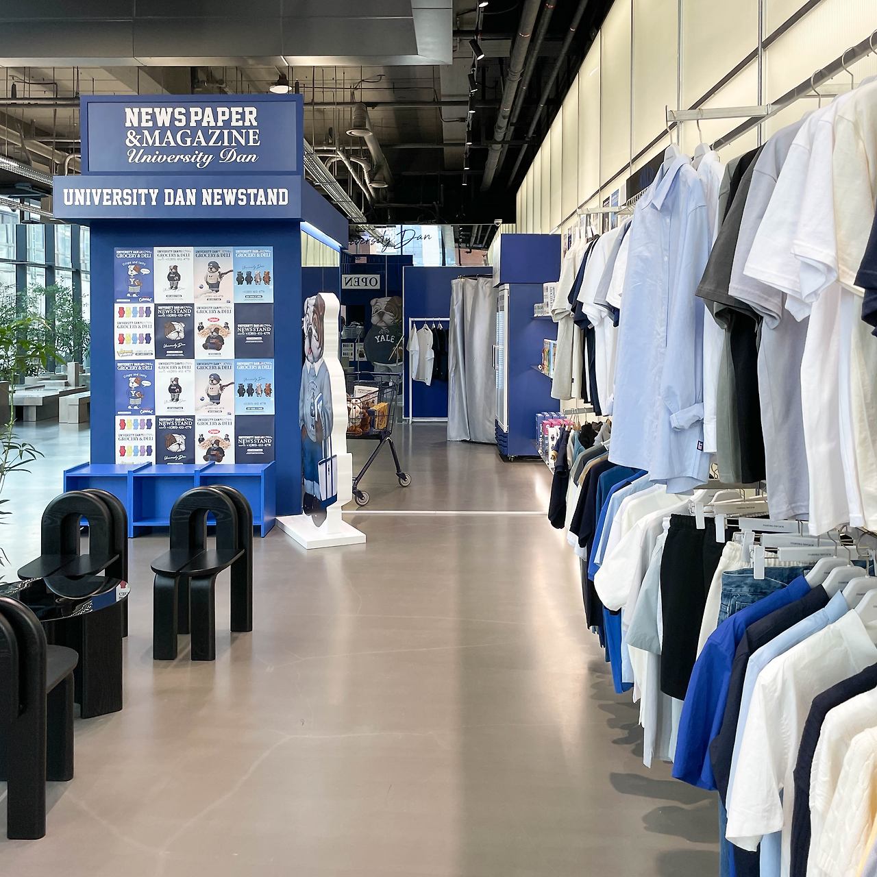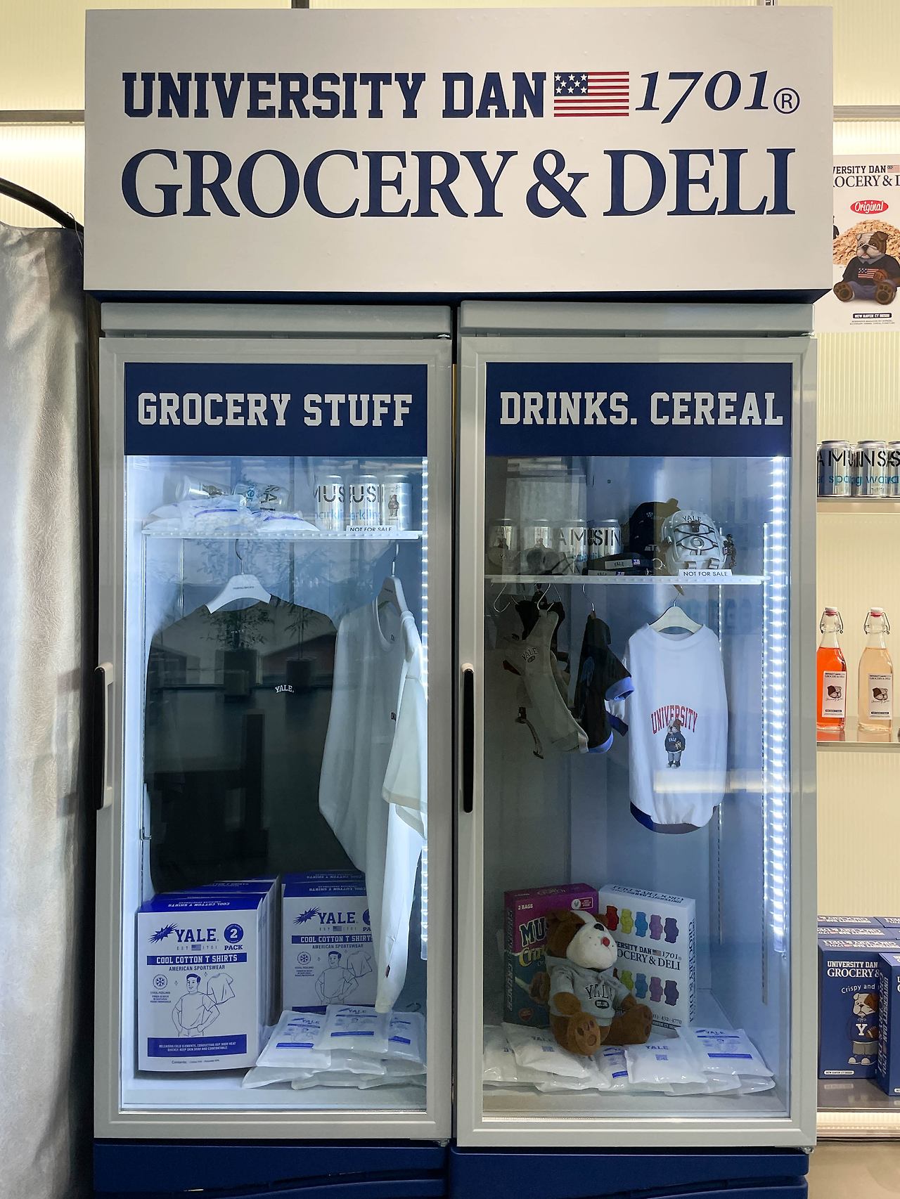 이번 팝업스토어의 타이틀은 GROCERY & DELI. 다양한 의류 아이템과 예일의 마스코트인 불독 유니버시티 댄 (UNIVERSITY DAN)의 캐릭터가 눈에 띈다 가운데 작은 가판대를 중심으로 티셔츠, 팬츠, 셔츠 등 다양한 예일의 컬렉션이 둘러싸여 있다. 옷 뿐만 아니라, 맥주나 인형 등 다양한 소품들도 디스플레이 되어 있었는데 마치 예일 대학교 바로 앞에 있는 스토어에 온 것 같은 기분도 든다.